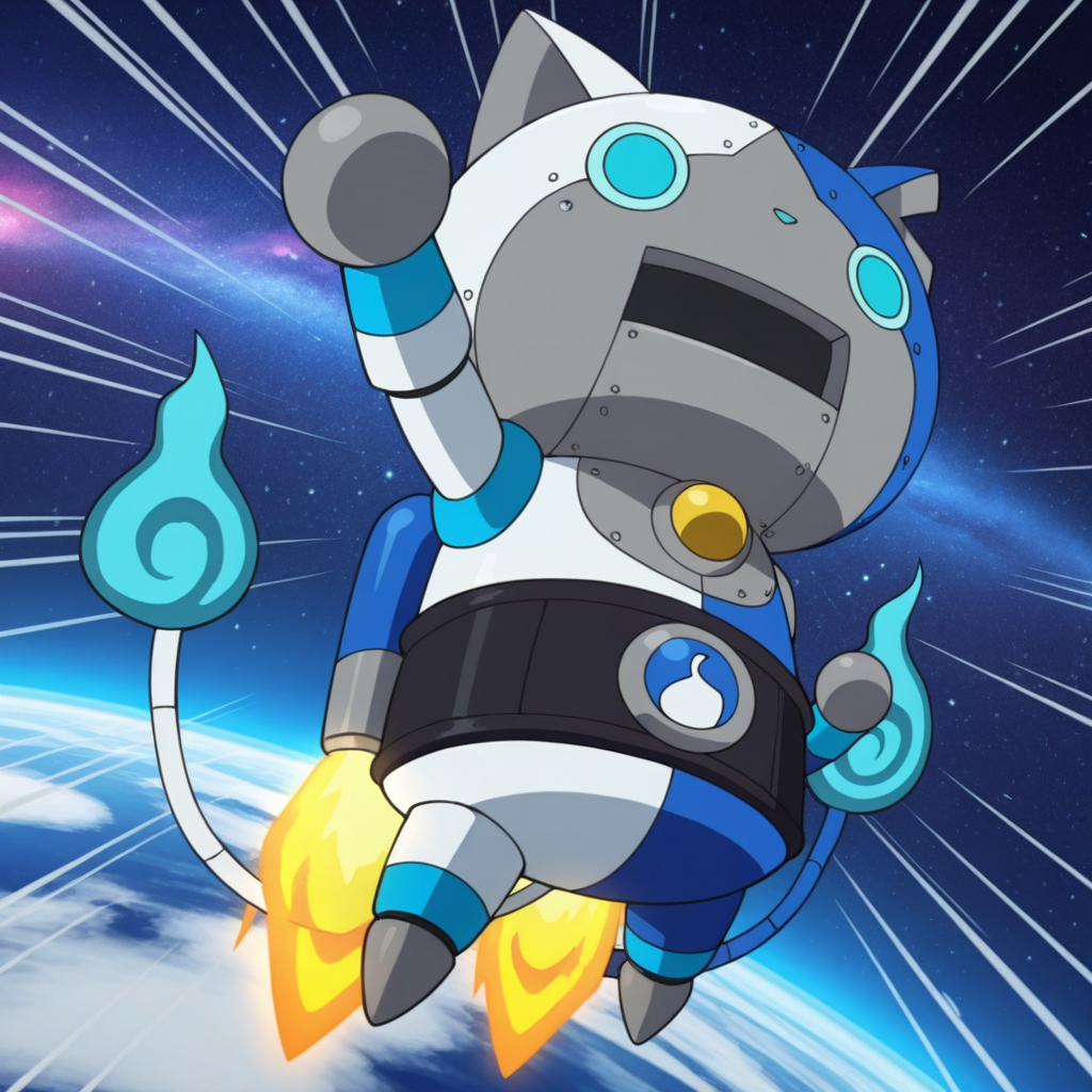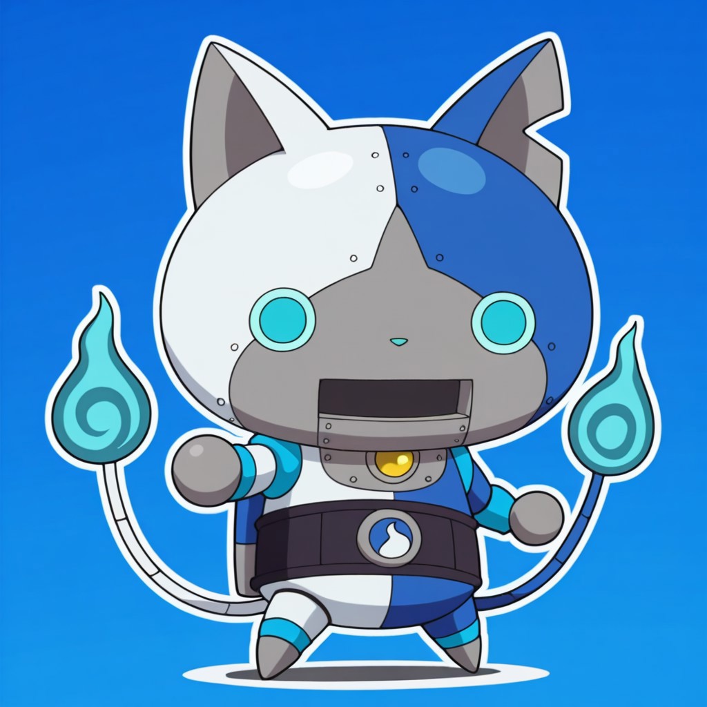 タグ: 伝統的な妖怪、ロボット、猫、猫の耳、青い目、青い鼻、灰色の口吻、耳の切り欠き、多色体、白い体、青い体、分割色体、炎先の尾、二本の尾、ジェットパック、腹巻、二本の尾、