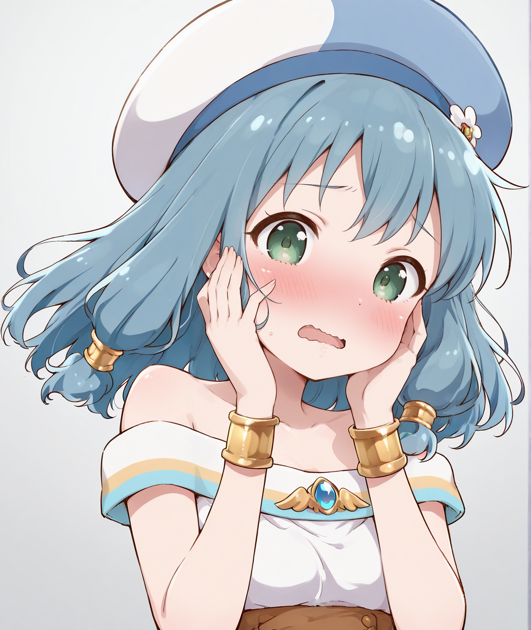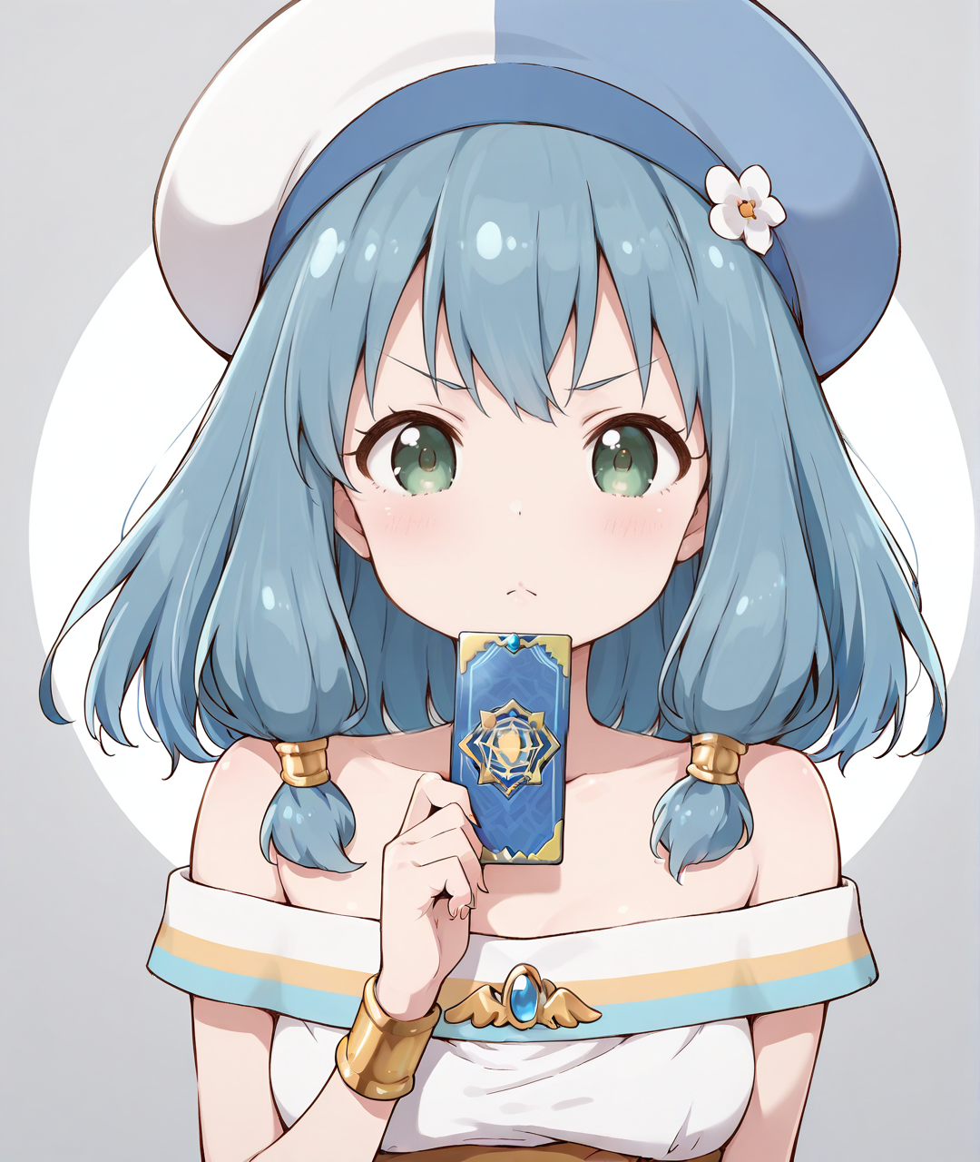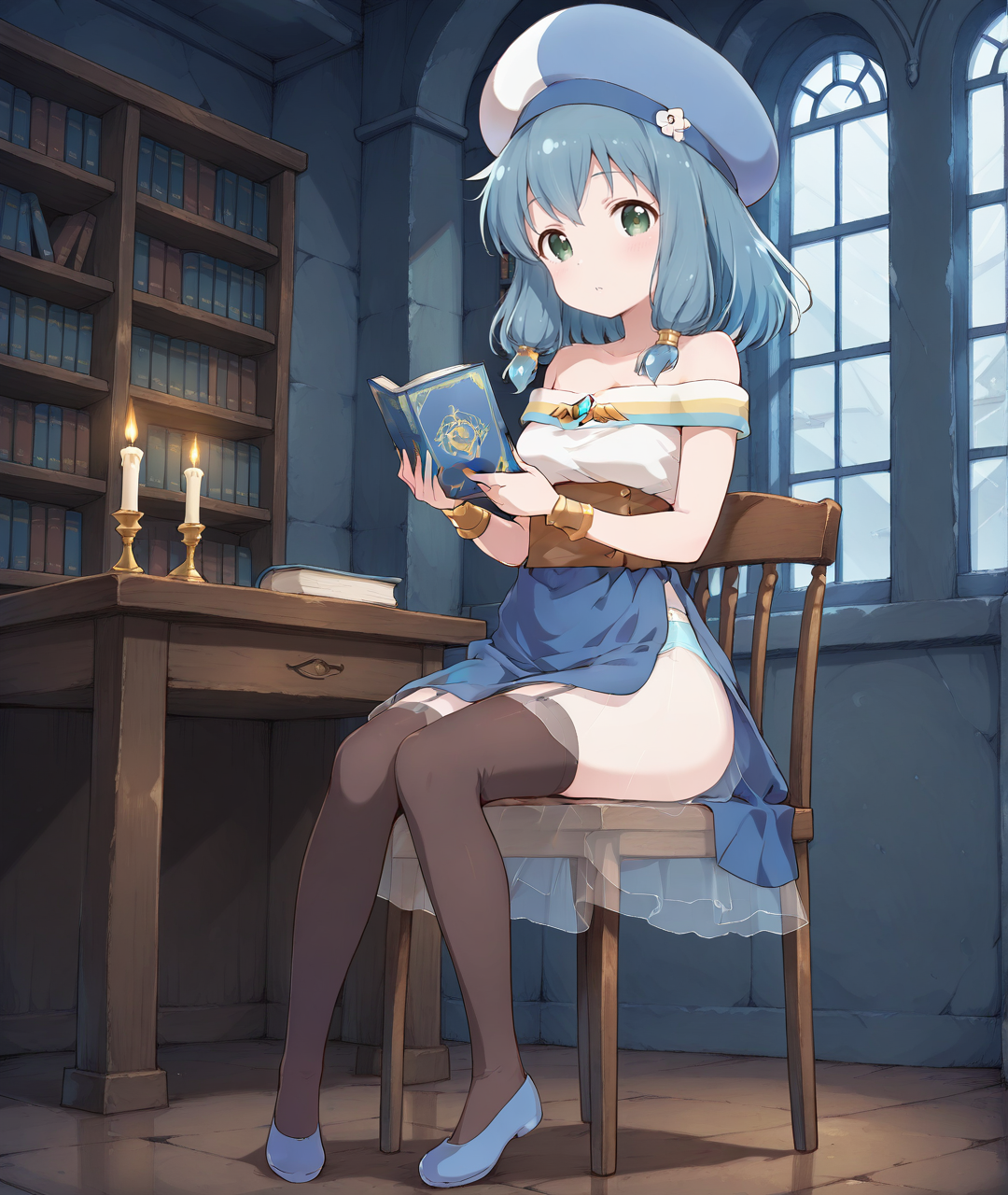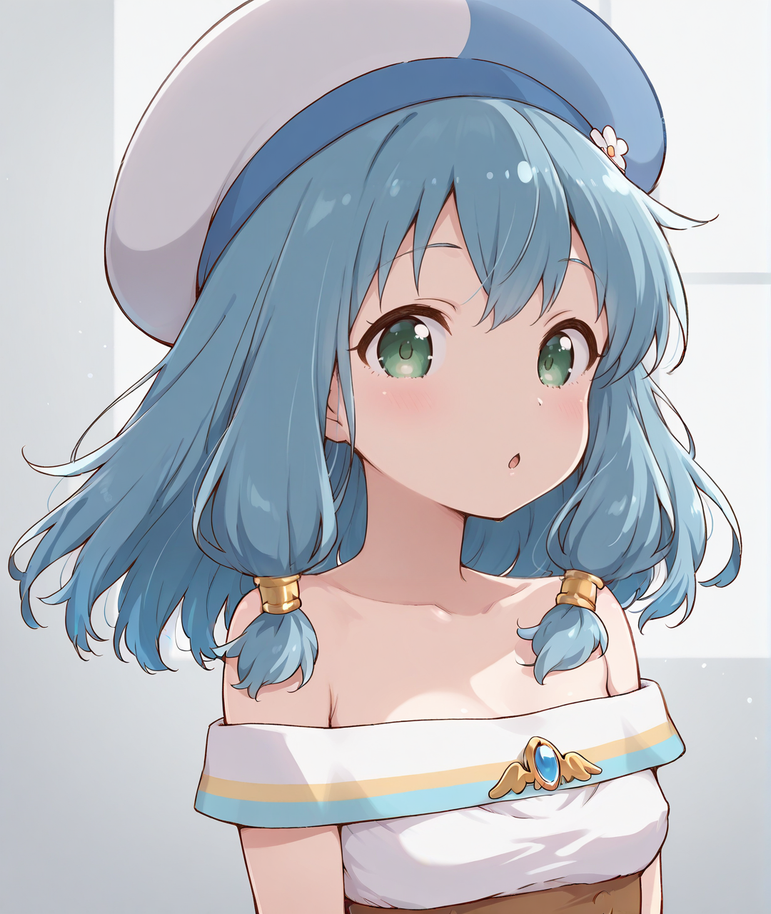 タグ: MeiBase, 緑の目, 青い髪, 中くらいの髪, ツートンのベレー帽, 白いベレー帽, 青いベレー帽, 白い髪の花, 金色の髪飾り, 肩出し, 锁骨, 小さな胸, 金色のブローチ, 青い宝石, オフショルダーのシャツ, 白いシャツ, ワンショルダー, 金色のブレスレット, 茶色のサッシュ, 青いスカート, サイドスリット, 透けているスカート, 青いパンツ, 茶色のガーターストラップ, 茶色のハイソックス, 青い靴,