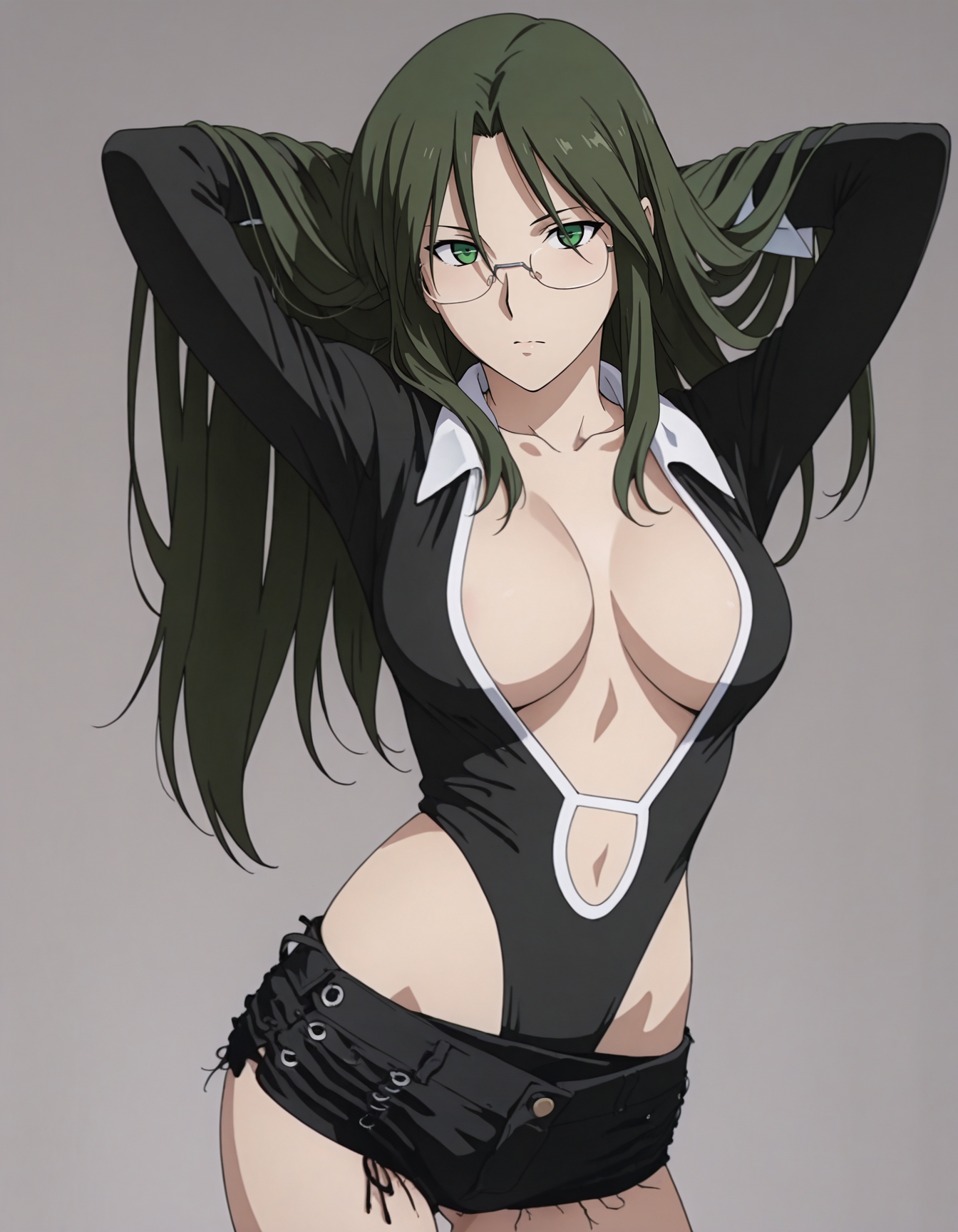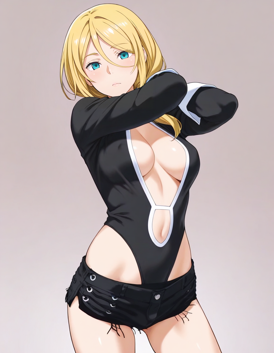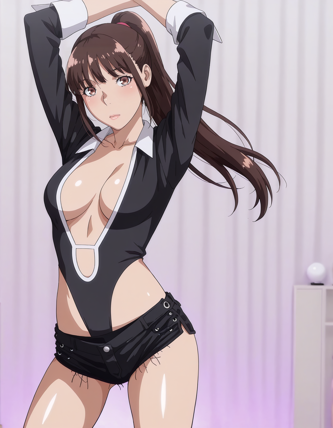 mai_bj_leotard,black_leotard,center_opening,short_shorts,black_shorts