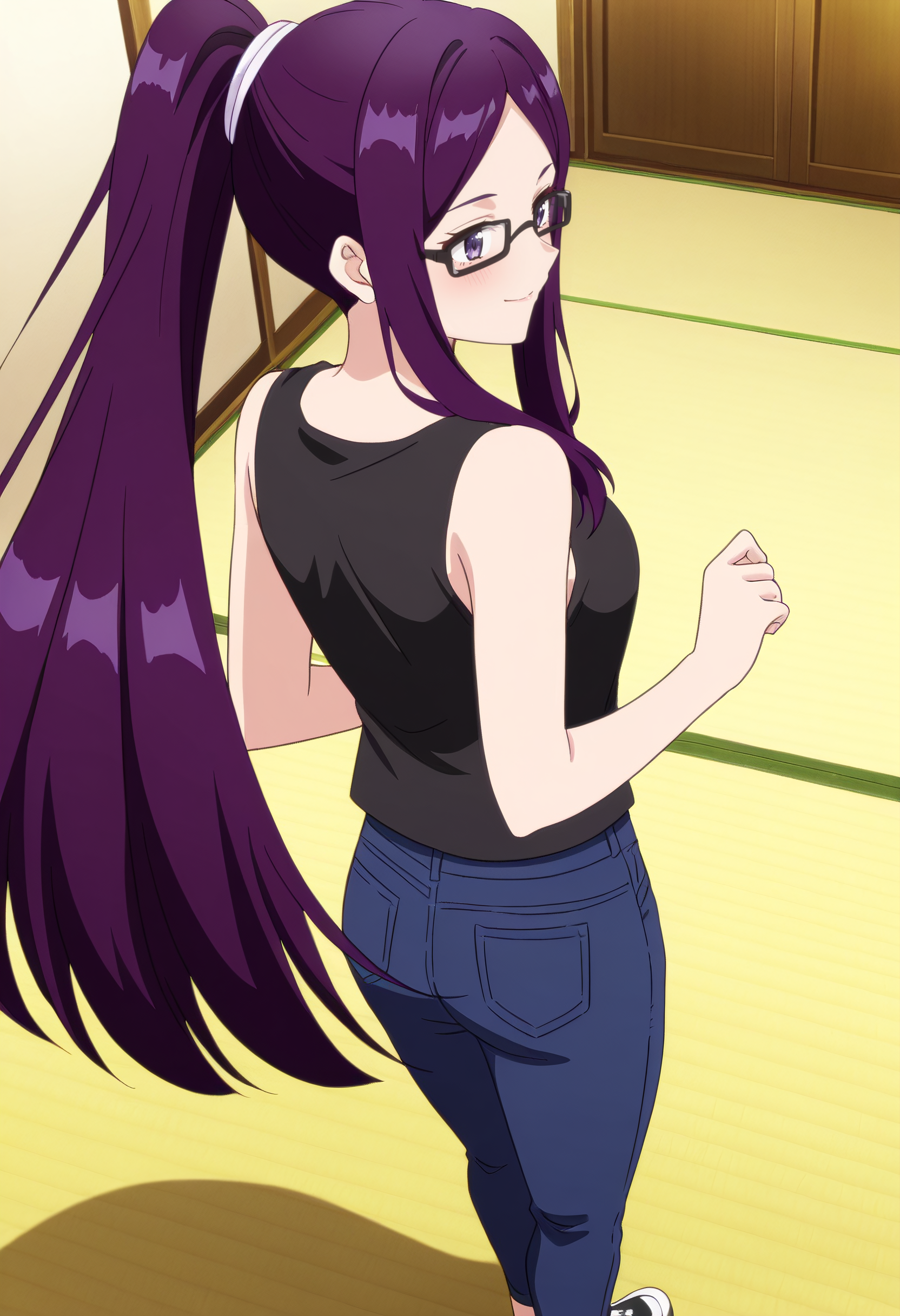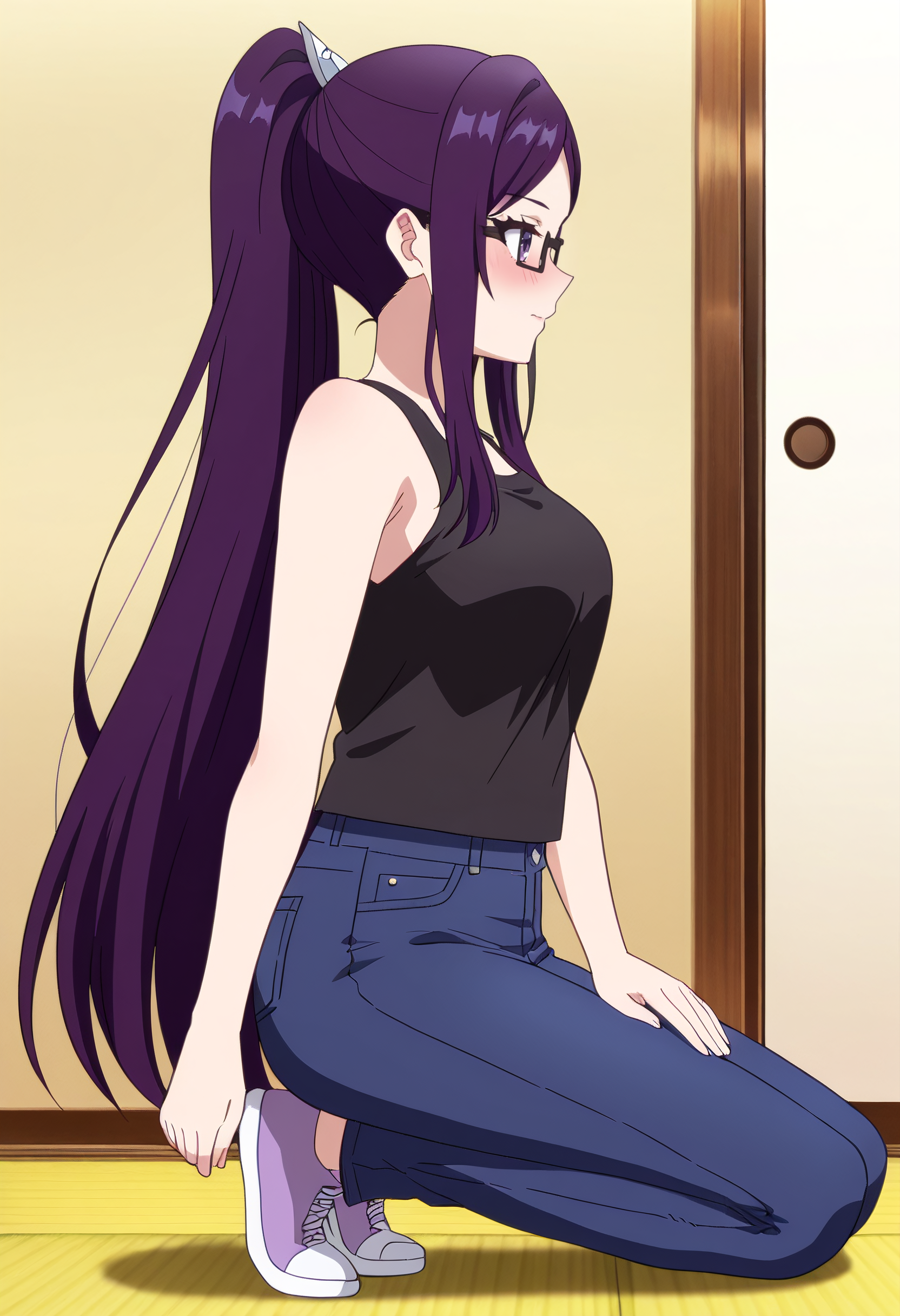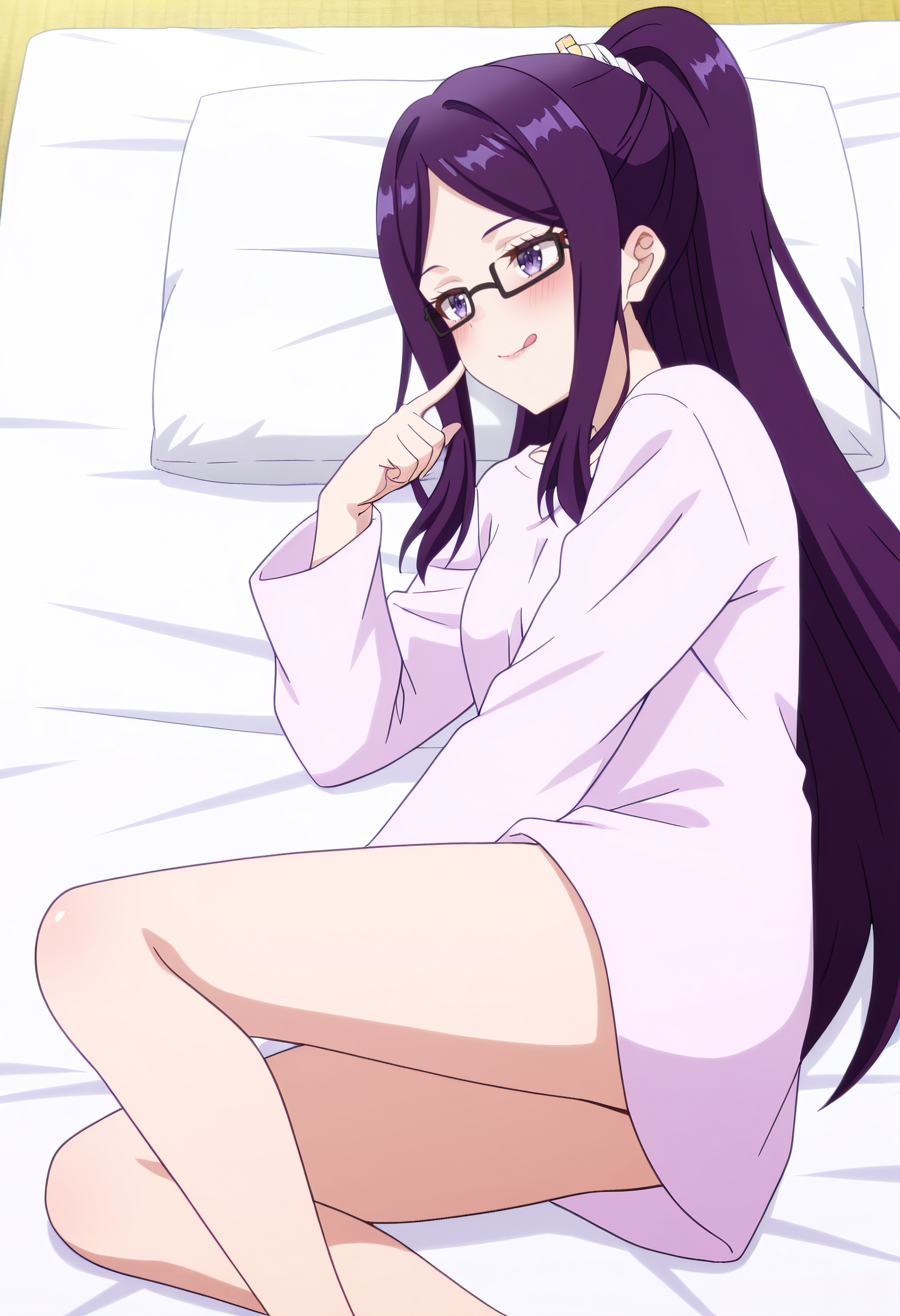 DNYYumi、長い髪、紫の髪、紫の目、ポニーテール、前髪、非常に長い髪、サイドロール、眼鏡、黒枠のメガネ、