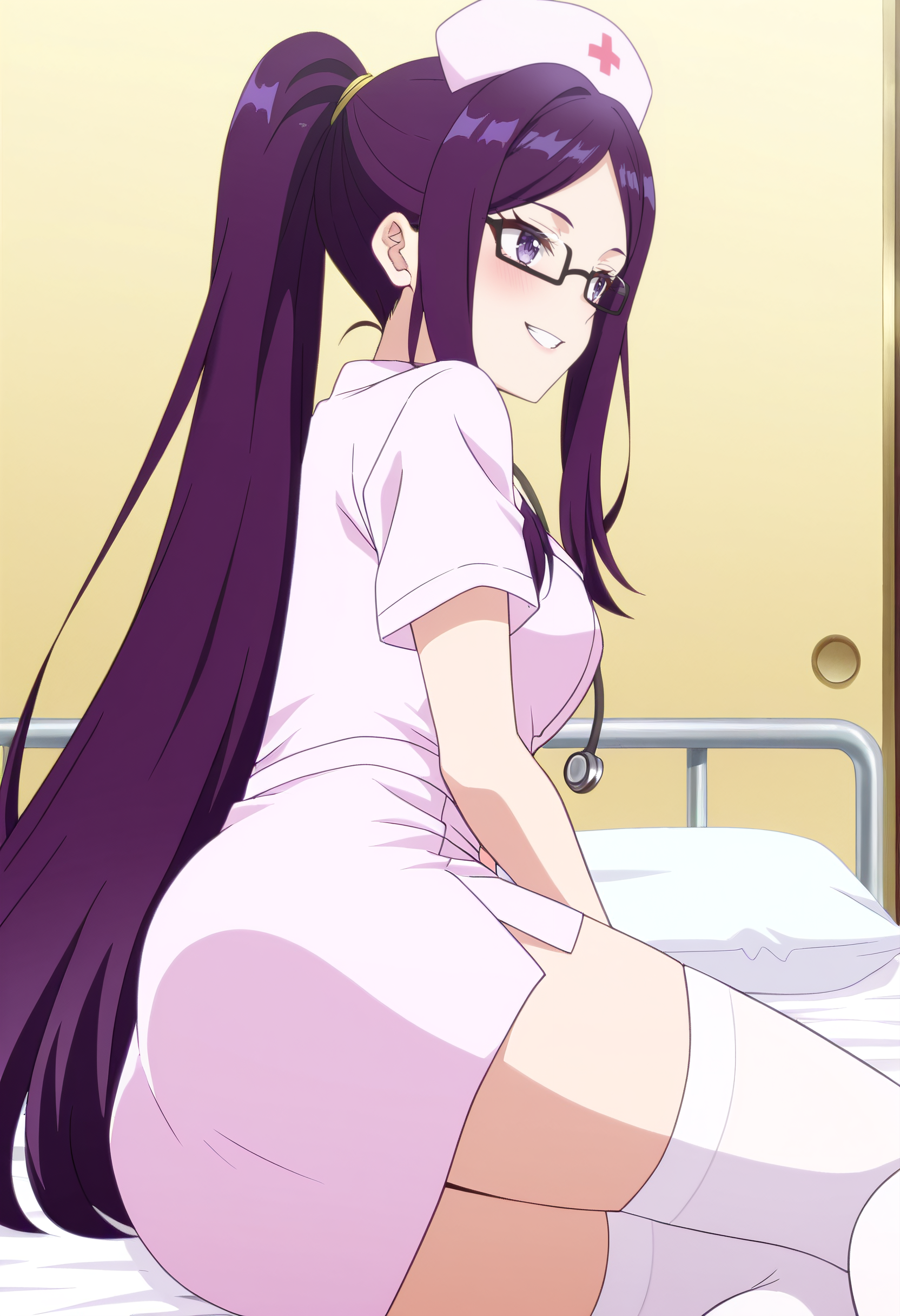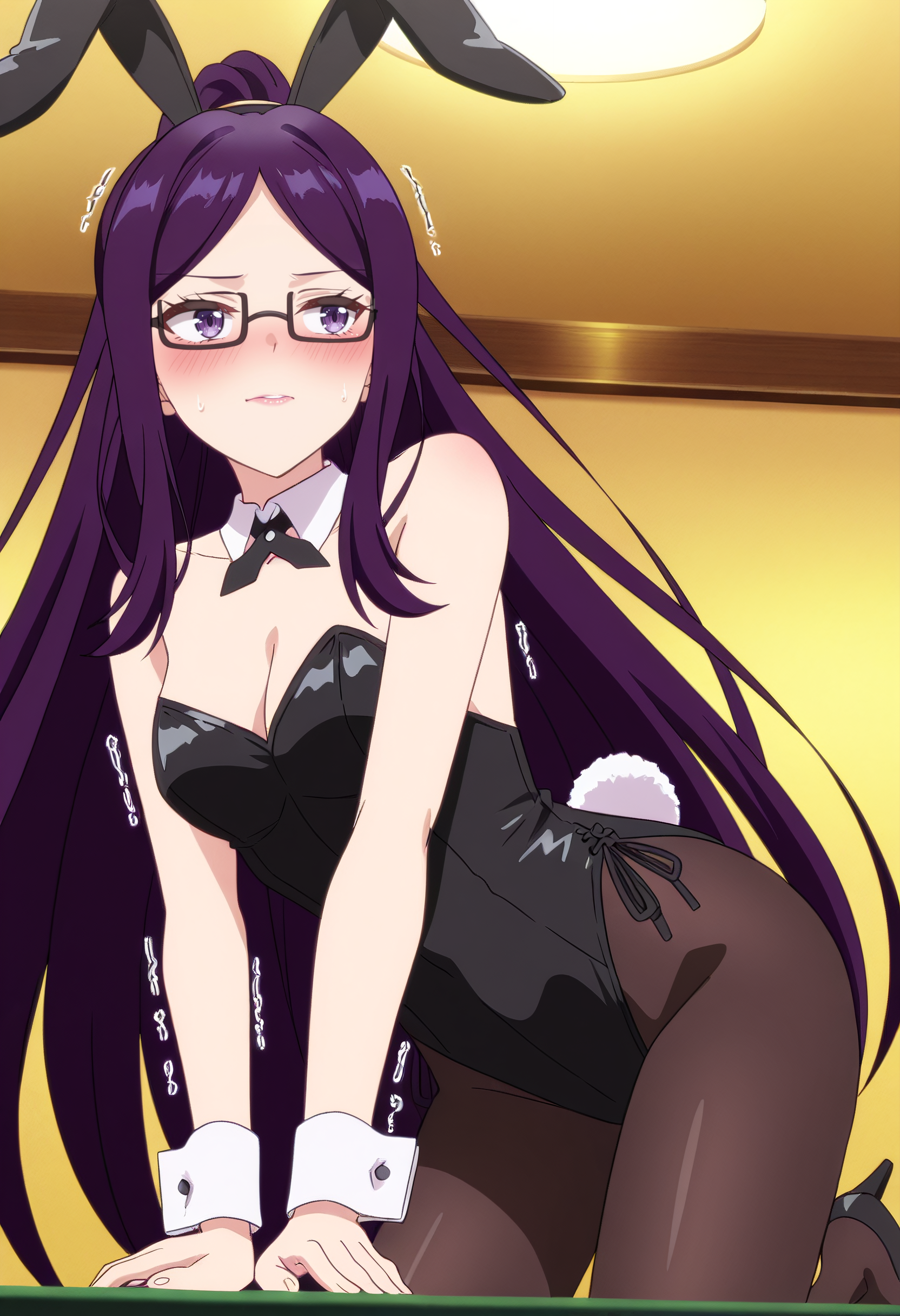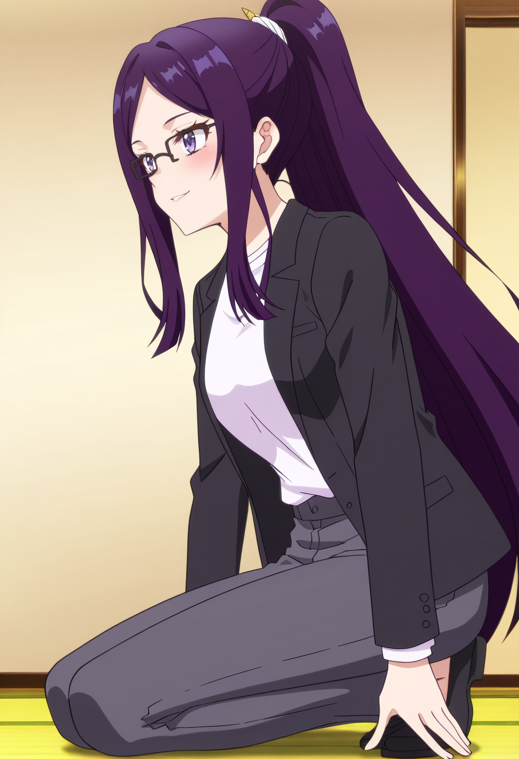 DNYYumi、長い髪、紫の髪、紫の目、ポニーテール、前髪、非常に長い髪、サイドロール、眼鏡、黒枠のメガネ、