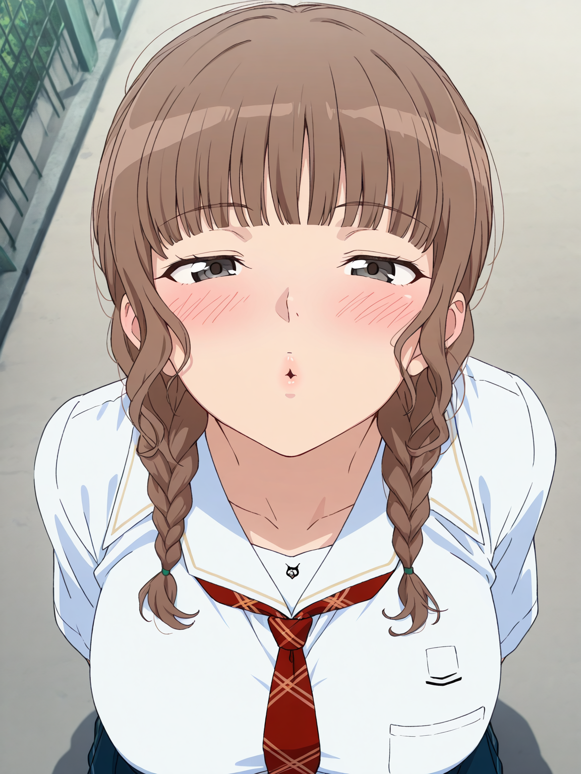 1girl, mizusawa mao, solo, kimi kiss, anime coloring, general, outdoors, waving, long hair, braid, brown hair, blunt bangs, black eyes, large breasts, white shirt, red necktie, pleated skirt, blue skirt