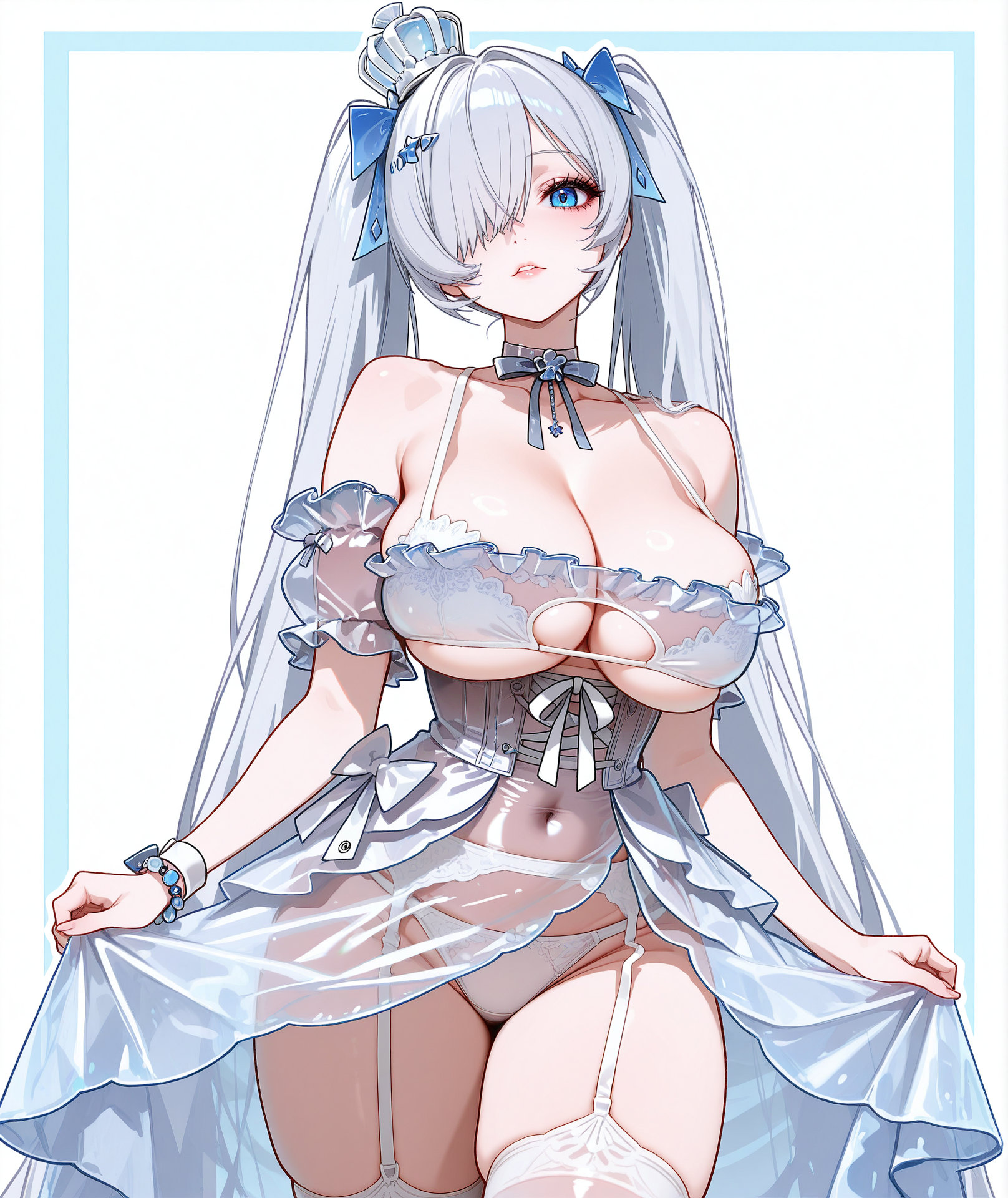 - まつげ、鼻、唇、長い髪、青い目、非常に長い髪、ツインテール、白髪、グレーの髪、片目に髪がかかる、片目が隠れている、