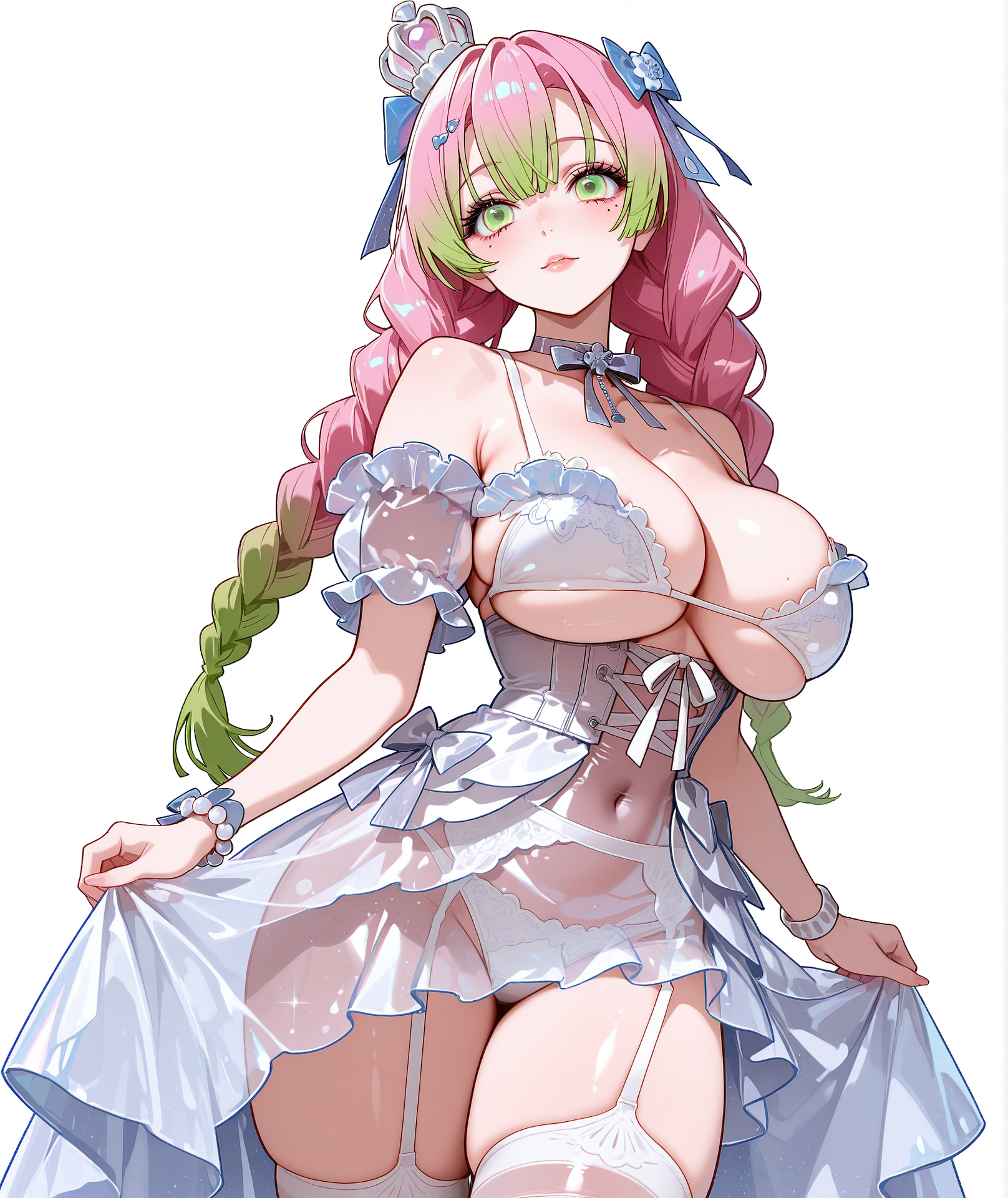ドレス、ボウ、リボン、ジュエリー、水着、短い袖、フリル、外れ袖、チョーカー、ふわふわ袖、ボウタイ、白いドレス、ブラ、ブレスレット、ふわふわ短い袖、透け感、青いボウ、ハーネック、白いビキニ、ガーターストラップ、ビーズ、白いブラ、ガーターベルト、ビーズブレスレット、透け感のあるドレス、白いガーターストラップ、