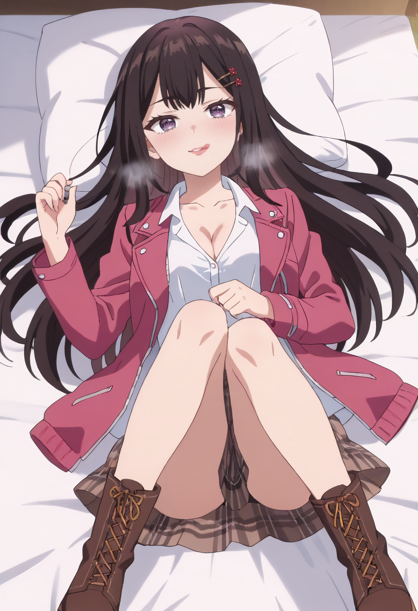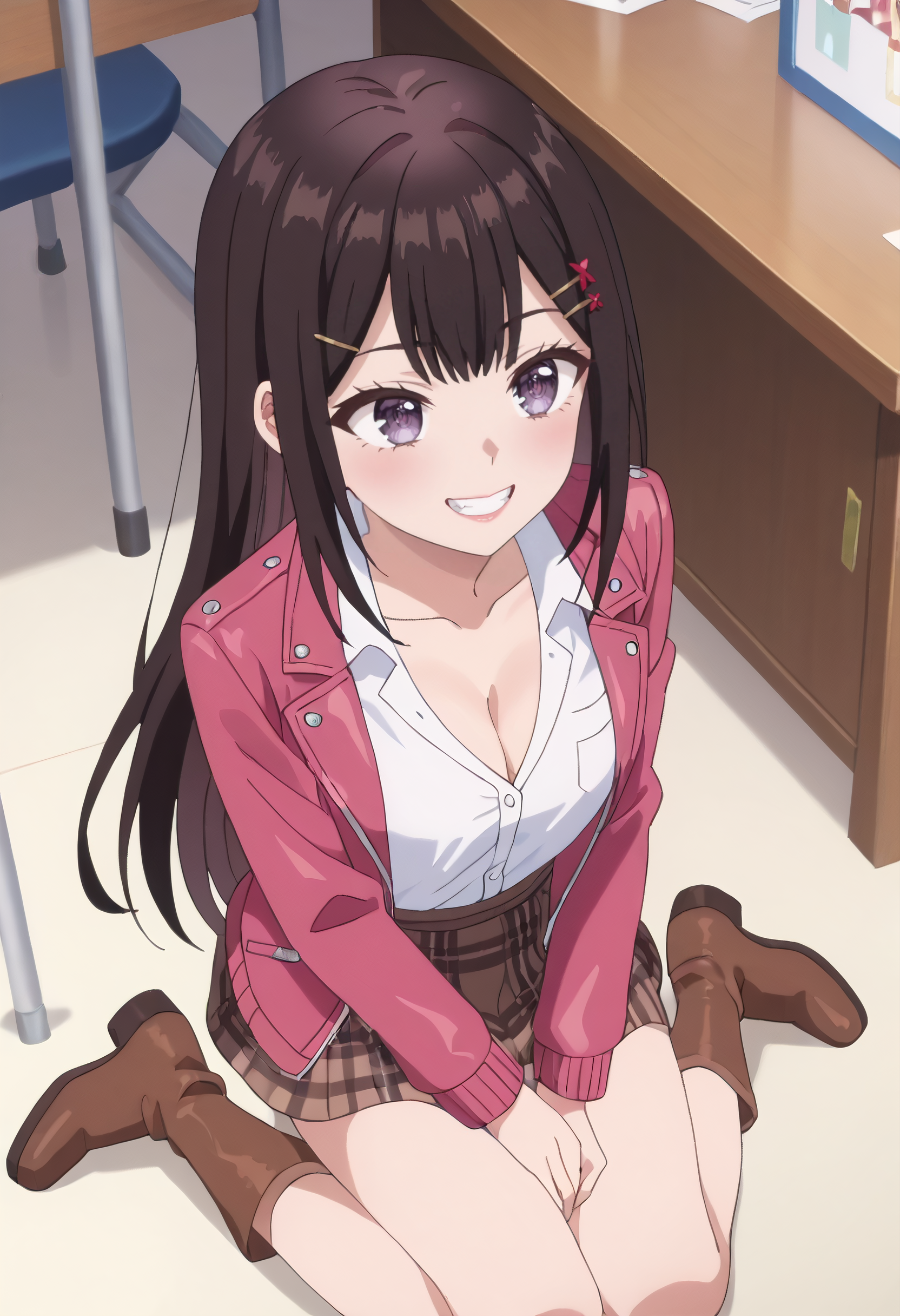 RionPinkJacket、シャツ、髪飾り、ジャケット、ヘアクリップ、白シャツ、鎖骨、長袖、襟付きシャツ、胸元、スカート、ドレッシーシャツ、オープンな服、オープンジャケット、ピンクのジャケット、チェック柄スカート、茶色のスカート、素足、ブーツ