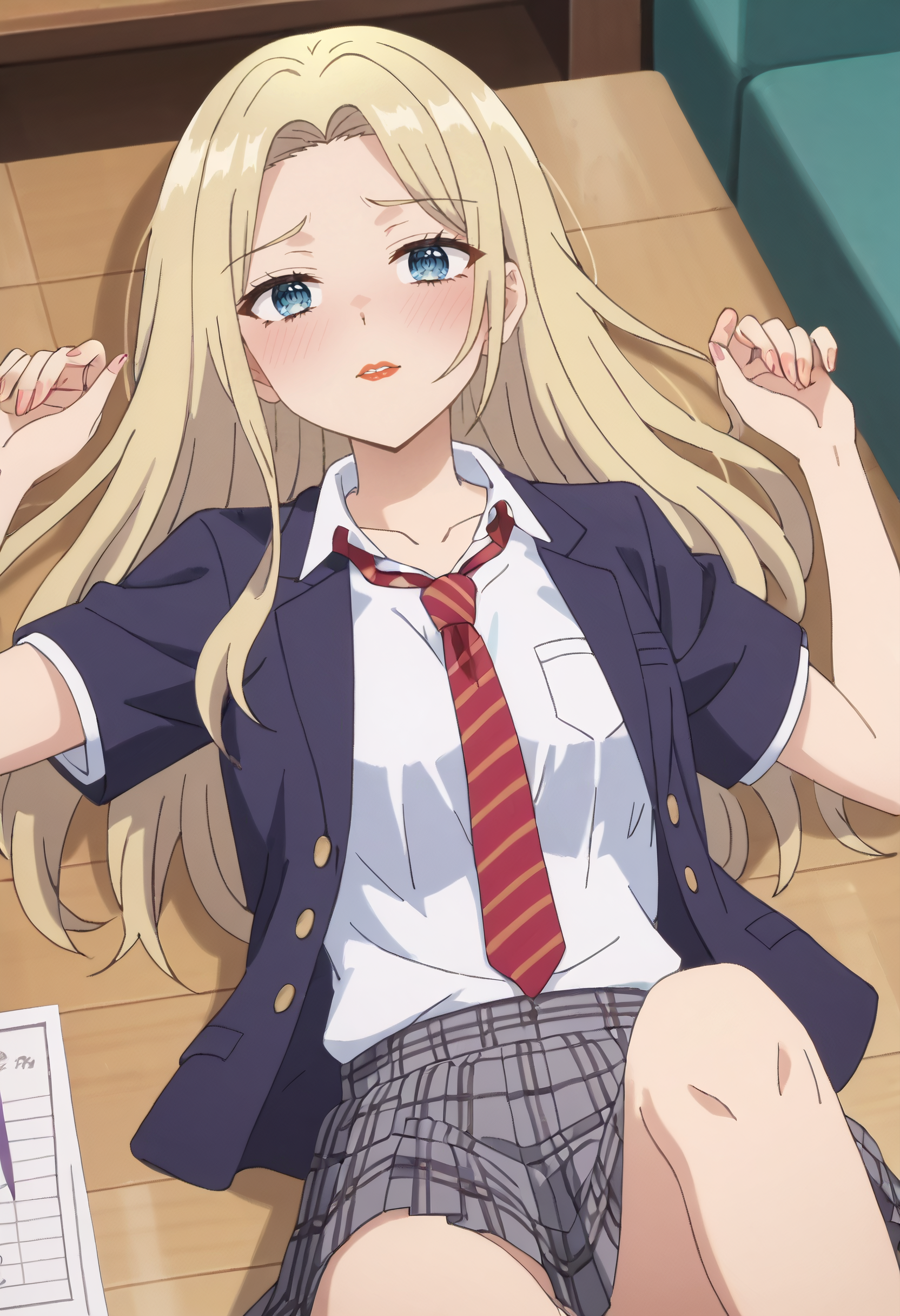 스커트, 학교 유니폼, 흰 셔츠, 빨간 넥타이, 줄무늬 넥타이, 짧은 소매, 스커트, 체크무늬 스커트, 칼라 셔츠, 목뼈, 풀린 넥타이,