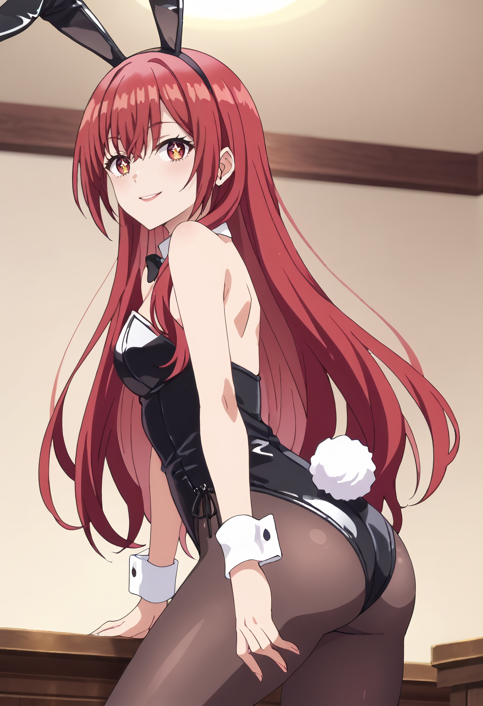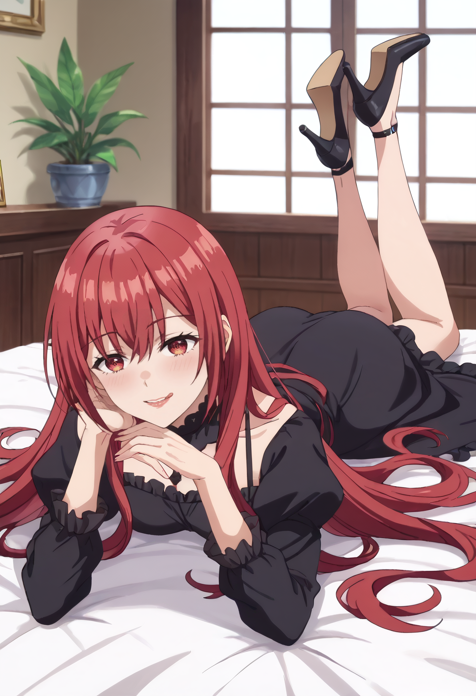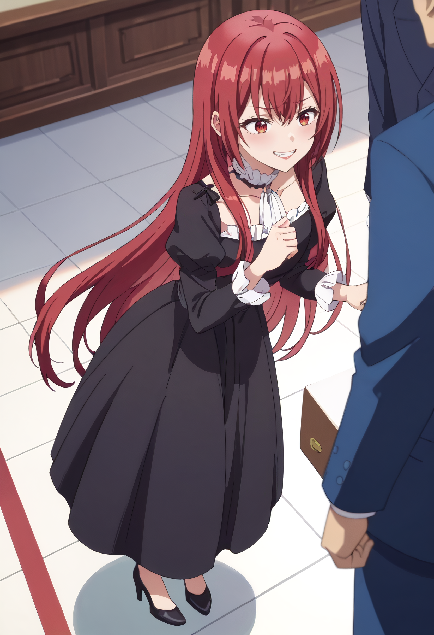 DNYKureha, 긴 머리, 빨간 머리, 앞머리, 머리 사이로 보이는 눈썹, 눈 사이의 머리, 빨간 눈, 매우 긴 머리,