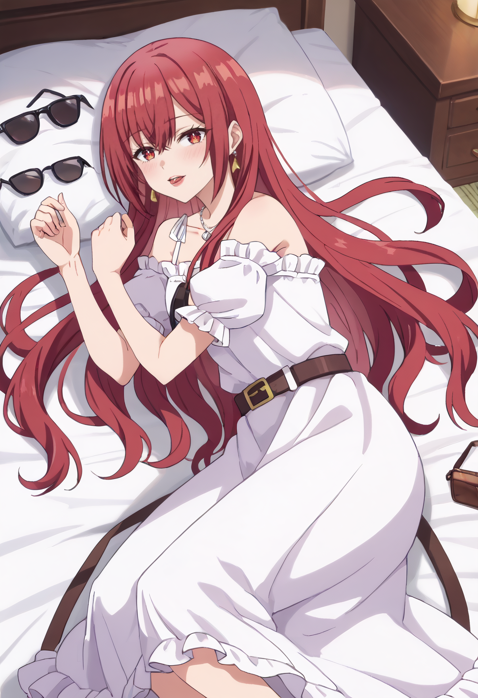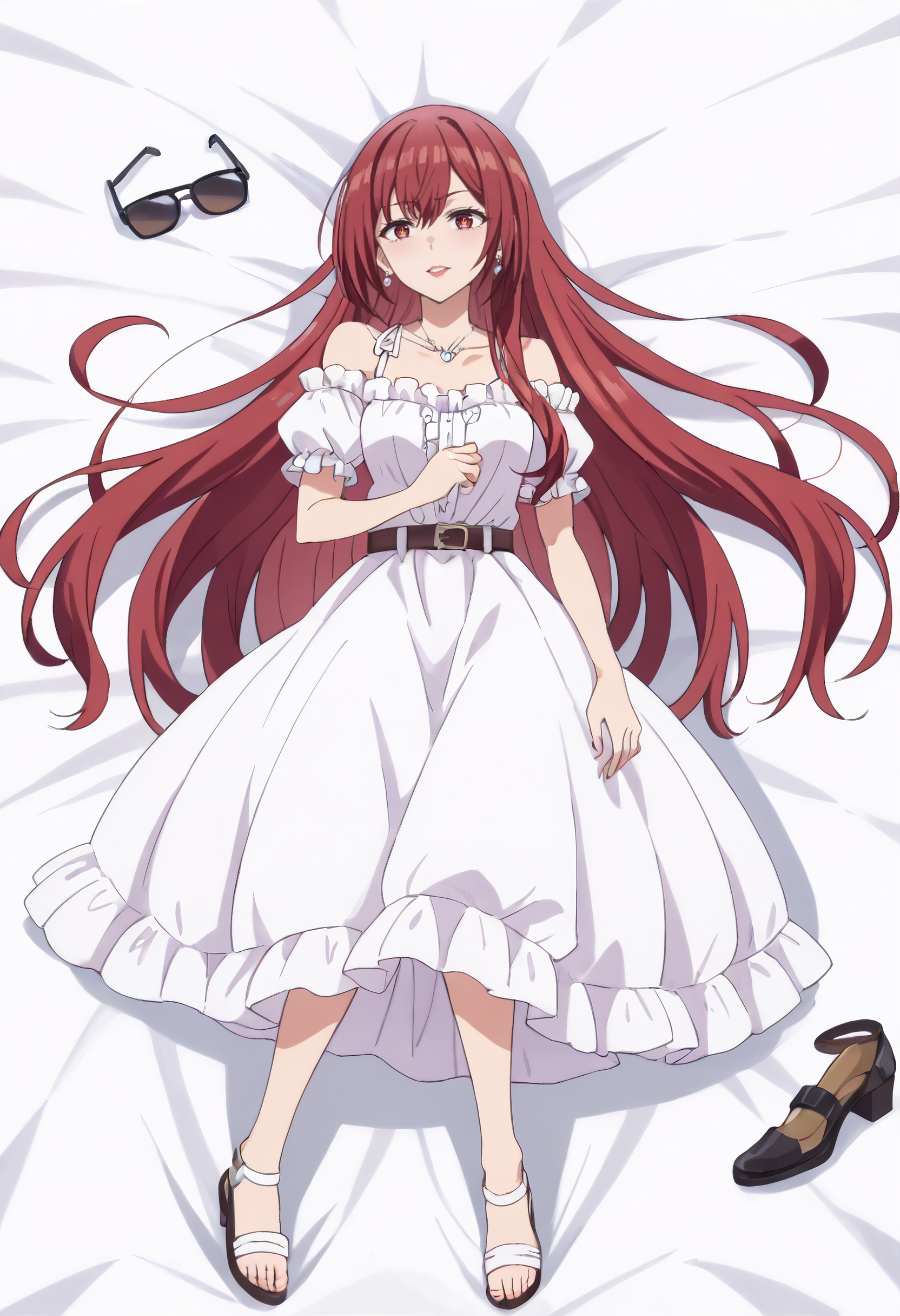 KurehaFrilled, 어깨 노출, 보석, 드레스, 목걸이, 견갑골, 어깨 드레스, 흰색 드레스, 짧은 소매, 귀걸이, 풍선 소매, 프릴, 풍선 짧은 소매, 벨트, 검은 벨트, 선글라스,