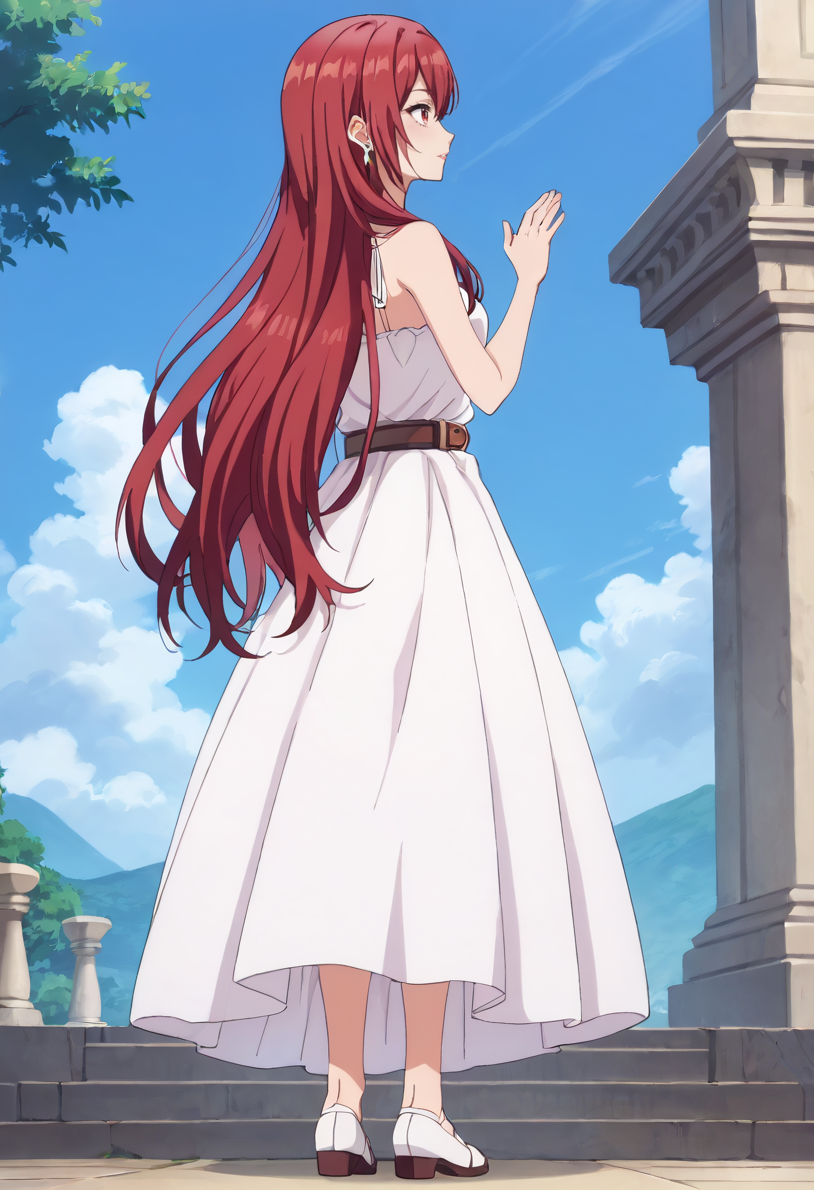 KurehaDress, 소매 없음, 어깨 노출, 드레스, 흰색 드레스, 벨트, 팔 노출, 귀걸이, 보석, 벨트 버클, 소매 없는 드레스, 갈색 벨트,