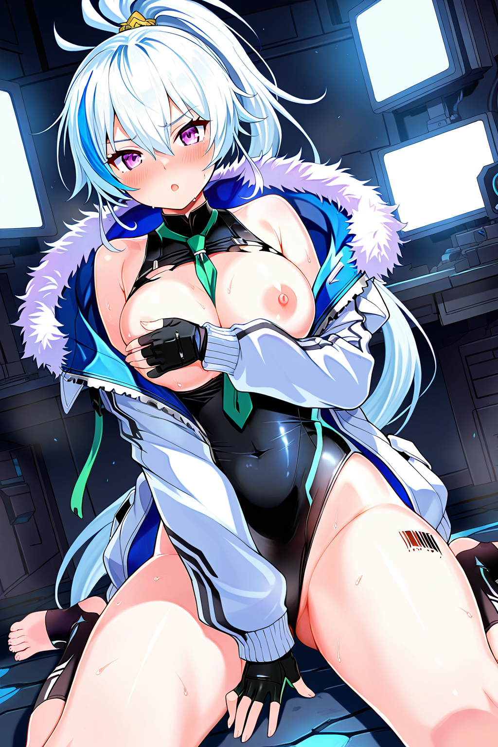 sw_ephnel, 1girl, solo, 紫色の目, 多色の髪, 白髪, ストライプ髪, 青髪, 大きな胸, 肩出し, sw_def, 長髪, ポニーテール, 髪飾り, 緑色のネクタイ, 白いジャケット, ファーのトリム, 長袖, 開いたジャケット, 肩出し, 黒い手袋, 黒いハイレグレオタード, 腹巻きカバー, 脚のタトゥー, バーコードタトゥー, ネイビーハイソックス, 黒いつま先なし脚衣,
