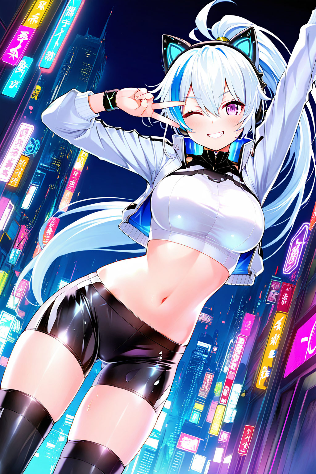 sw_ephnel, 1girl, solo, 紫色の目, 多色の髪, 白髪, ストライプ髪, 青髪, 大きな胸, sw_str, 長髪, ポニーテール, 猫耳ヘッドフォン, 白いクロップジャケット, 白い長袖, 開いた白いジャケット, 白いクロップトップ, 黒いリストバンド, 黒いバイクショーツ, 黒い太ももハイソックス, ラテックス脚衣, スニーカー,