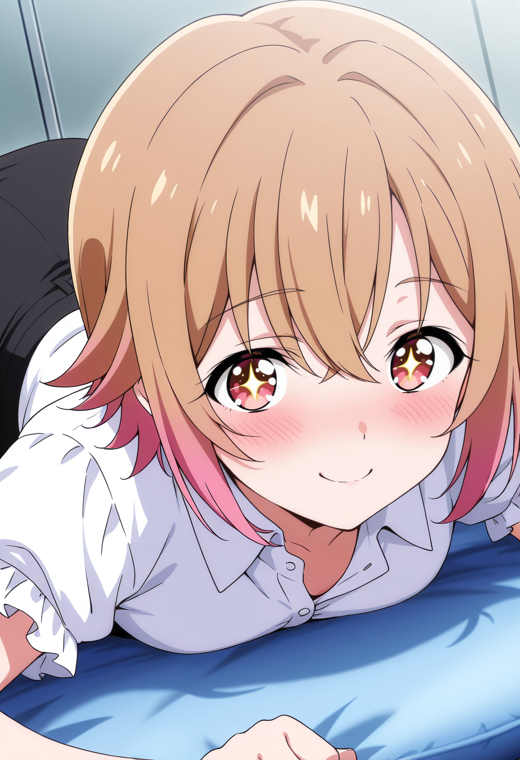 SMSSuzune, 앞머리, 단발, 머리카락 사이로 보이는 눈썹, 눈 사이의 머리카락, 연한 갈색 머리, 붉은 눈, 그라데이션 머리, 분홍색 머리,