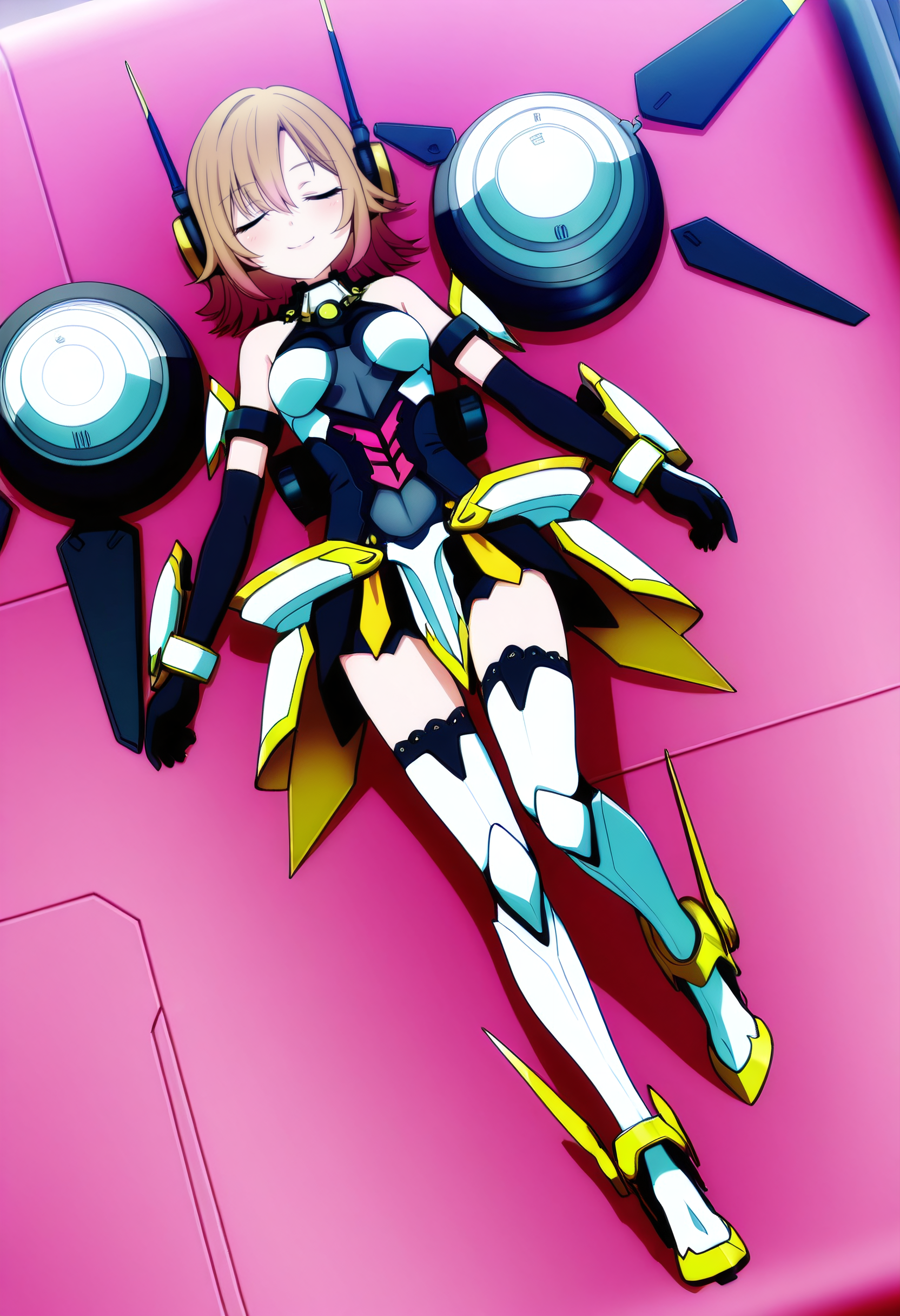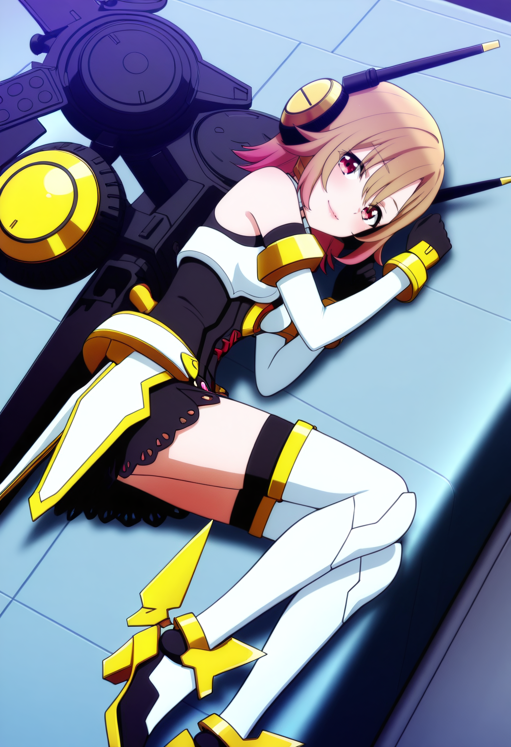 SuzuneMecha, 헤드기어, 메카 무스메, 장갑, 무기, 메카, 기계, 허벅지 스타킹, 갑옷, 총, 팔꿈치 장갑, 소매 없음, 과학 소설, 어깨 노출,