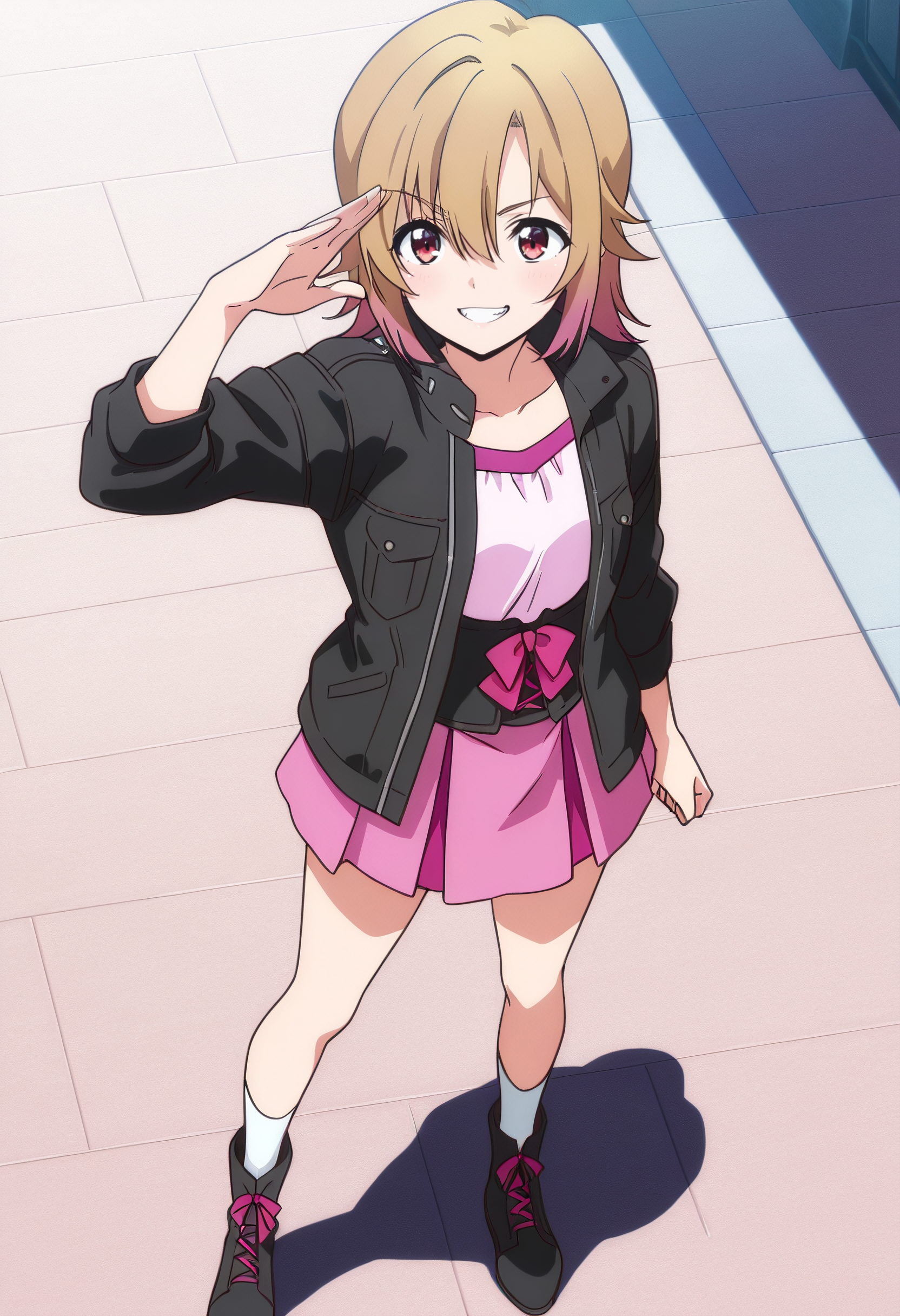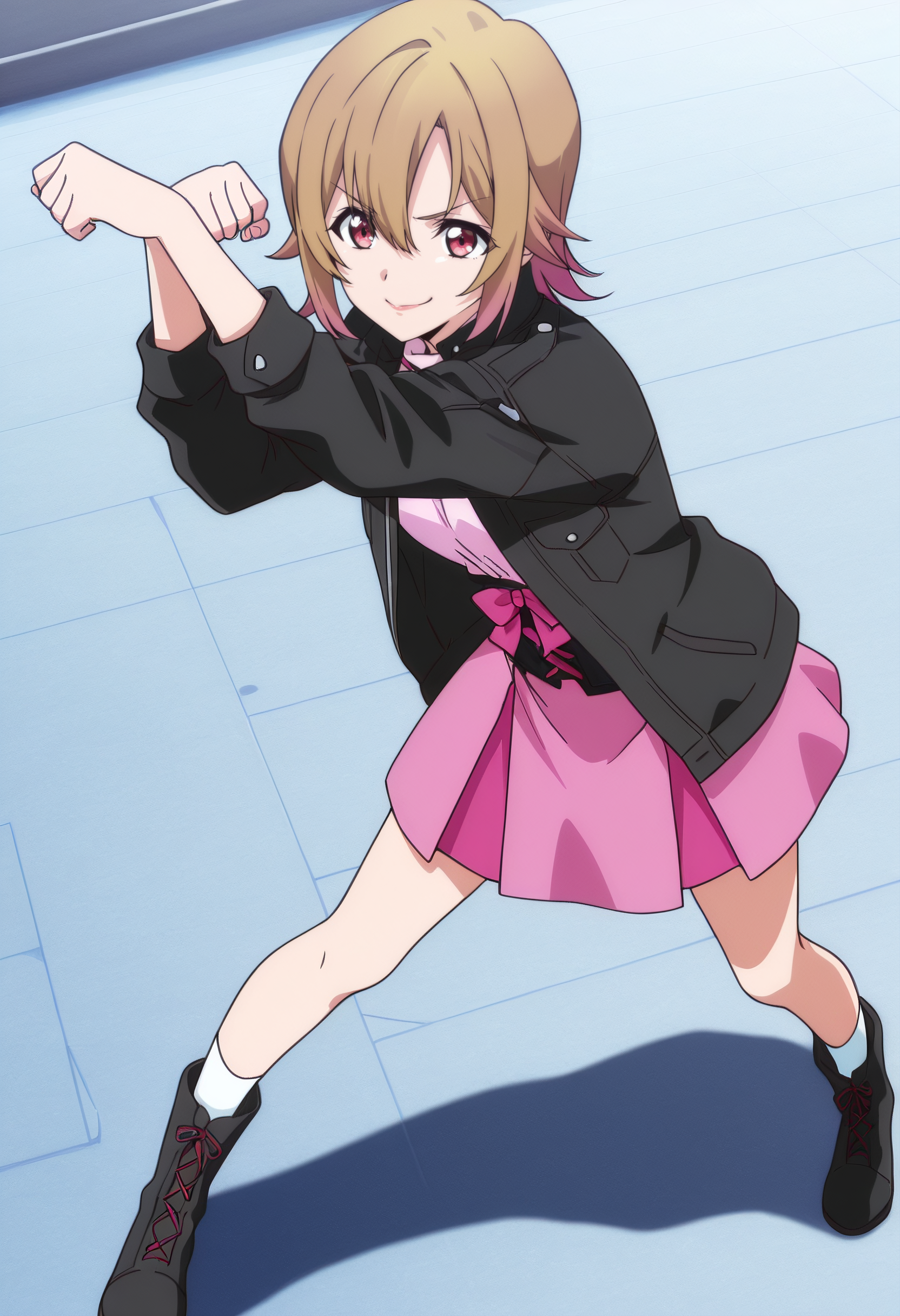 SuzuneJacket, 자켓, 셔츠, 검은 자켓, 벌어진 옷, 열린 자켓, 치마, 긴 소매, 분홍색 치마, 주름 치마, 미니스커트, 분홍색 셔츠, 양말, 가죽 자켓, 검은 신발, 분홍색 리본, 리본, 검은 띠,