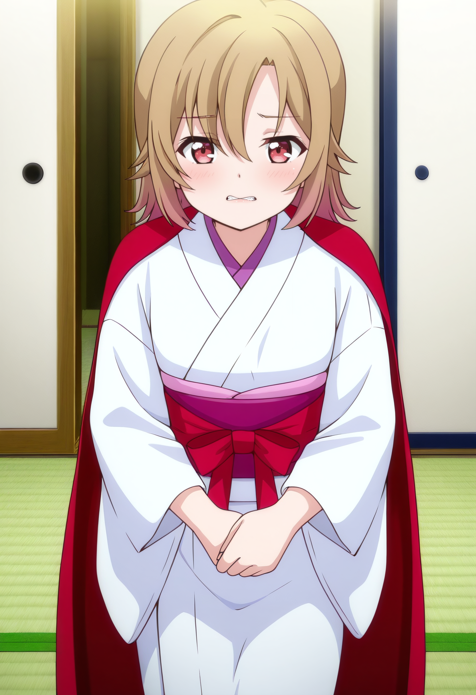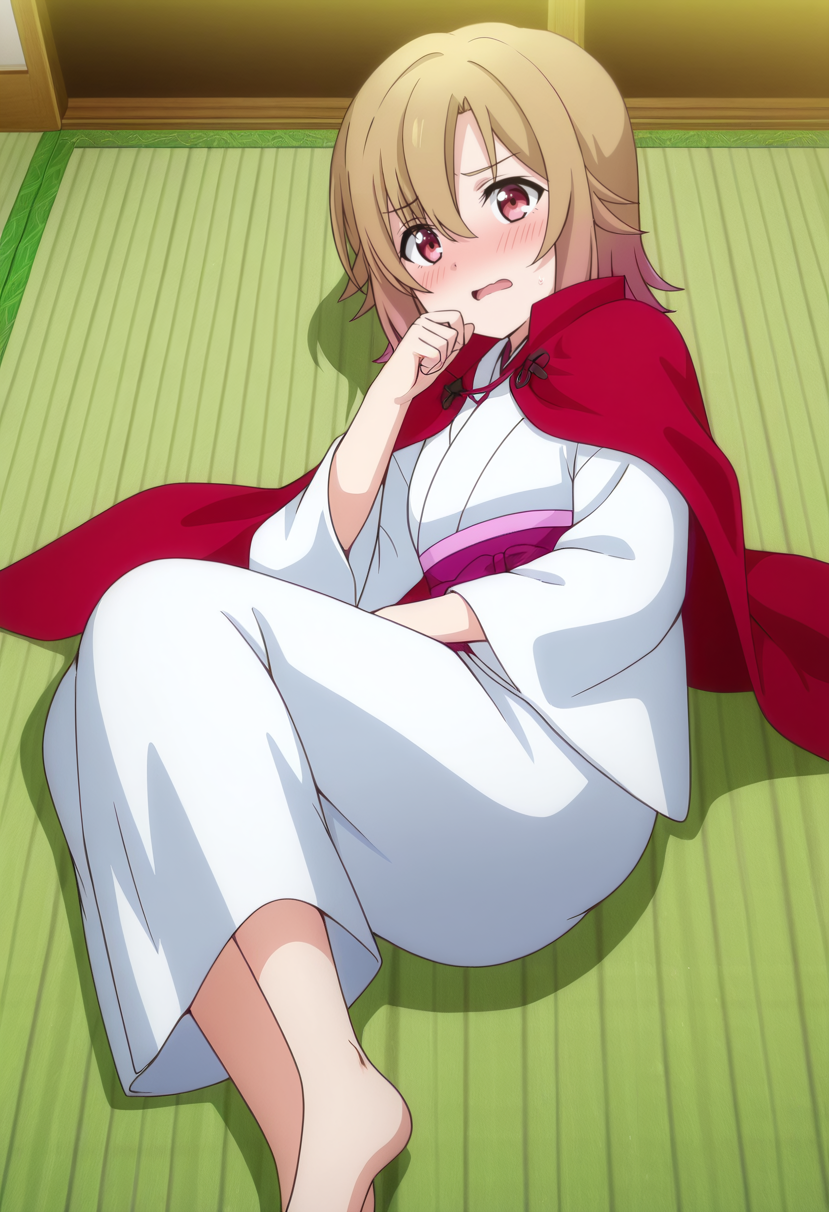 SuzuneRobe, 일본 복장, 기모노, 긴 소매, 타타미, 흰색 기모노, 붉은 망토, 붉은 리본, 리본, 넓은 소매,