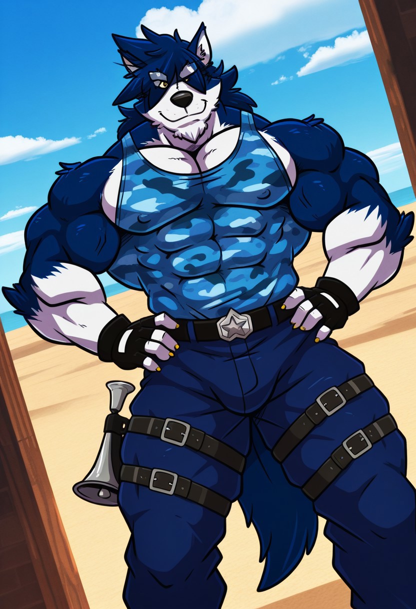 • 衣装プロンプト: "blue camouflage tank top, blue pants, belt, leg belt, black sleeveless shirt, red scarf"
