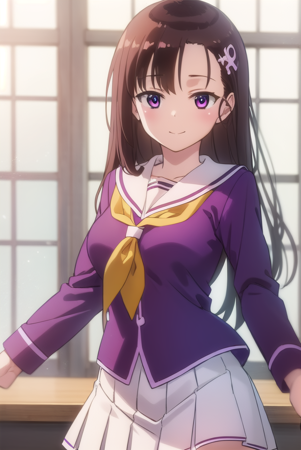 裙子,校服,百褶裙,serafuku,白裙,衬衫,紫色衬衫,水手领,白色水手领,长袖,领结,黄色领结,
