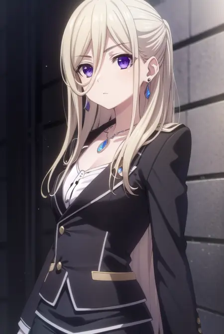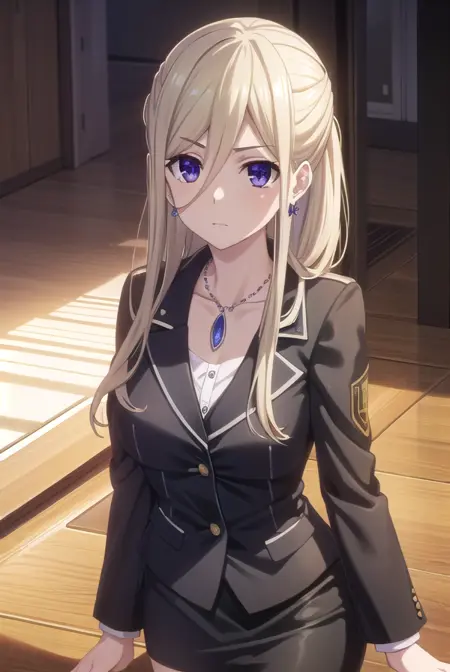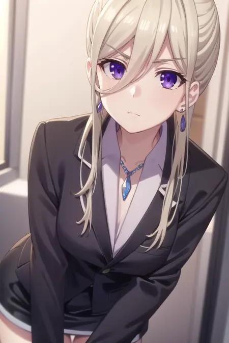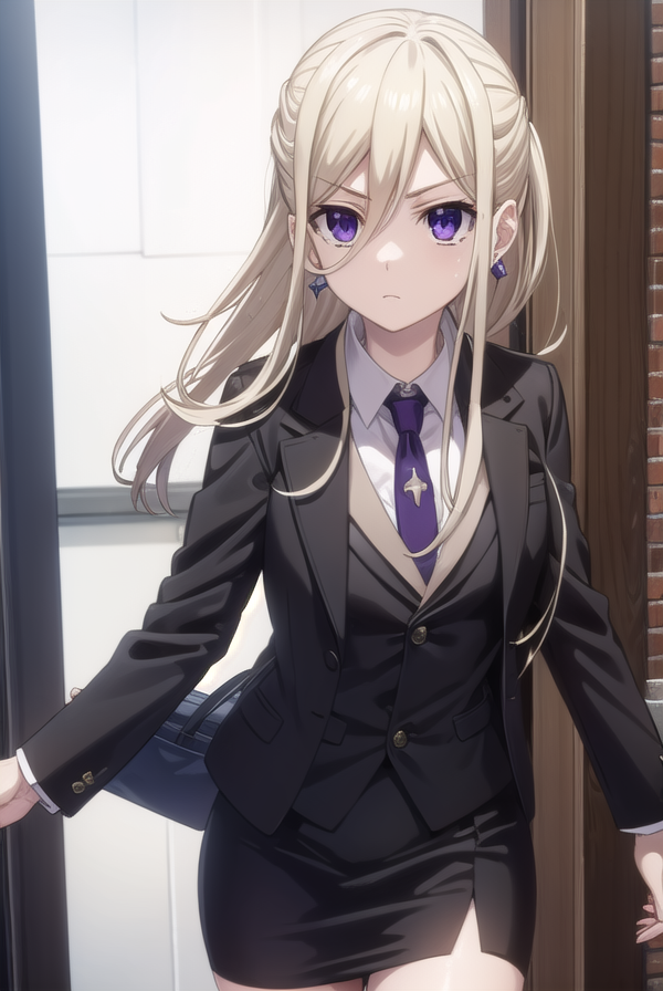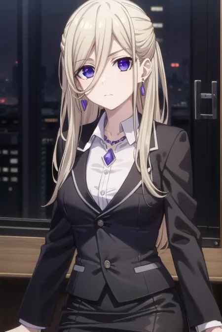 ellen mira mathers フォーマル、長い髪、金髪、(紫の目:1.1)、ジュエリー、イヤリング、ネックレス、フォーマル、スーツ、黒いスーツ、スカート、ペンシルスカート、黒いスカート、パンツストッキング、