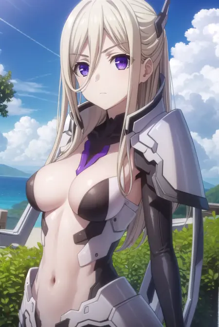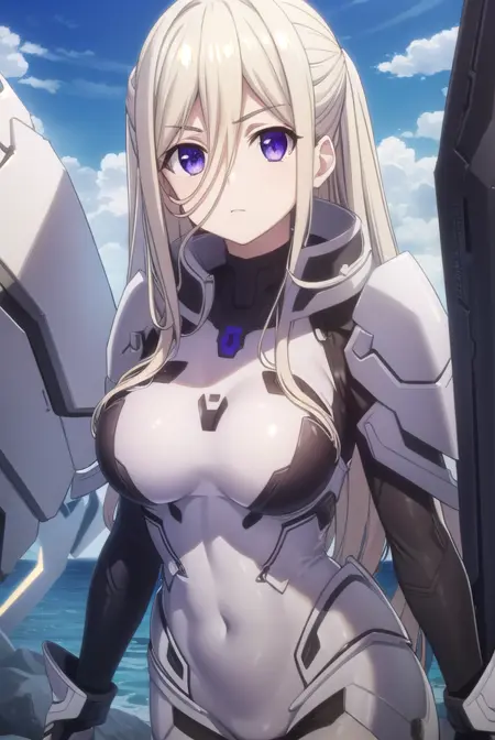 ellen mira mathers ast、長い髪、金髪、非常に長い髪、(紫の目:1.1)、目の間に髪、へそ、ボディスーツ、メカ娘、アーマー、