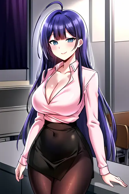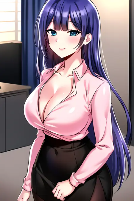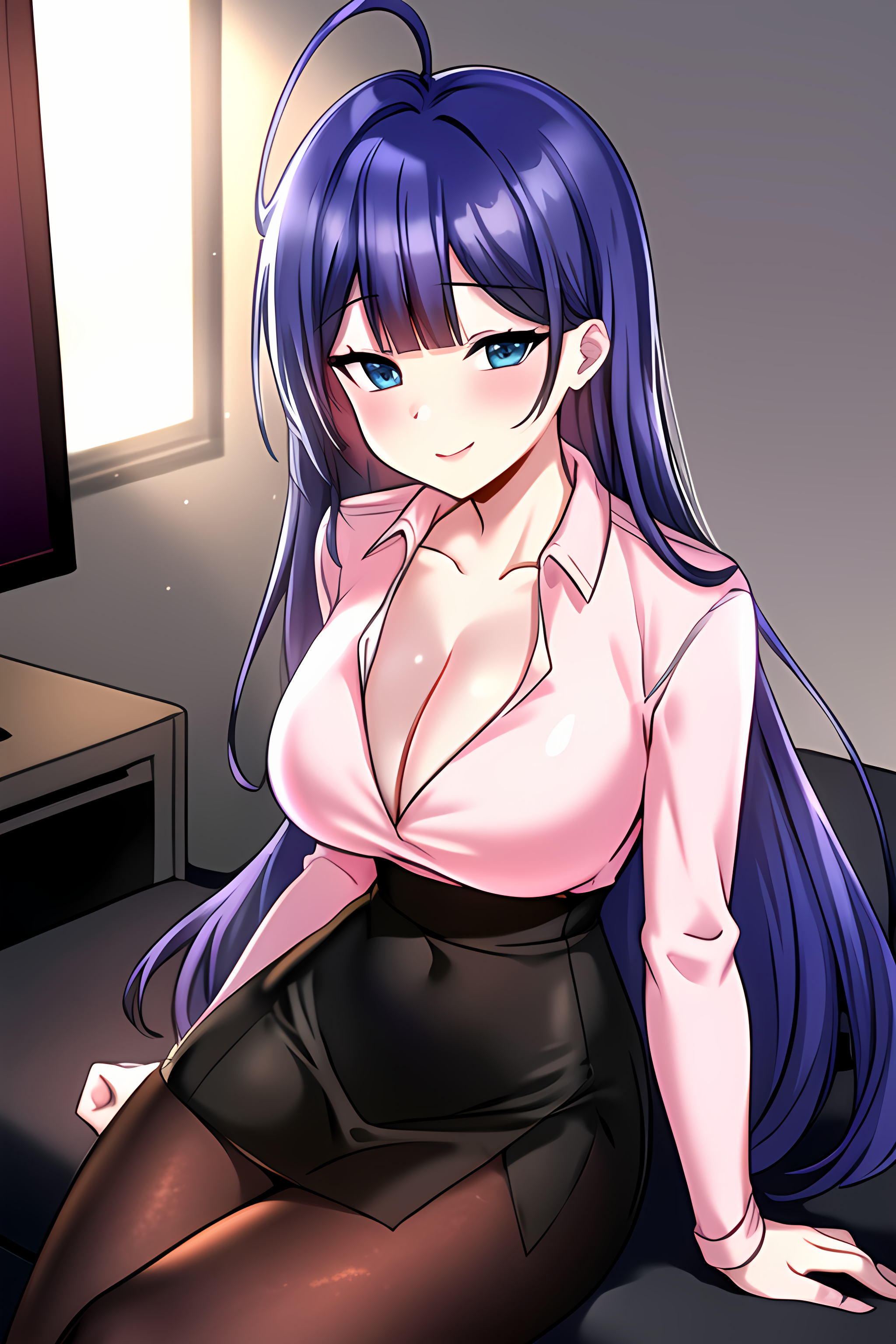 baek ahyoung \(uniform\) \(seka\), 赤手空拳, 发梢翘起, 刘海, 黑色短裙, 蓝眼睛, 蓝色头发, 挺胸, 锁骨, 眉毛透过头发可见, 粉色衬衫, 紫色头发, 长发, 直视观众, 办公室女郎, 连裤袜, 铅笔裙, 裙子