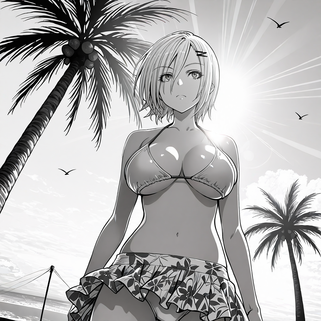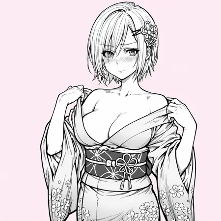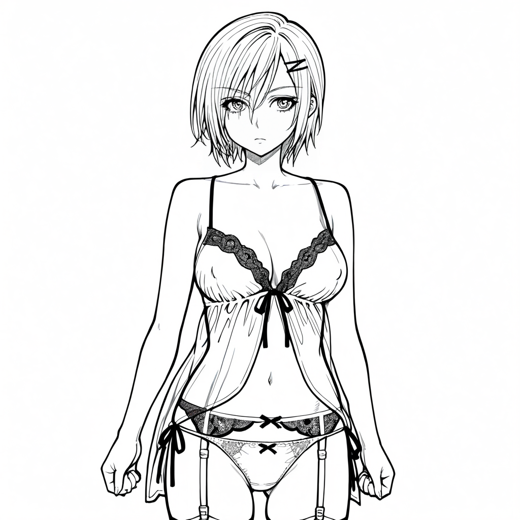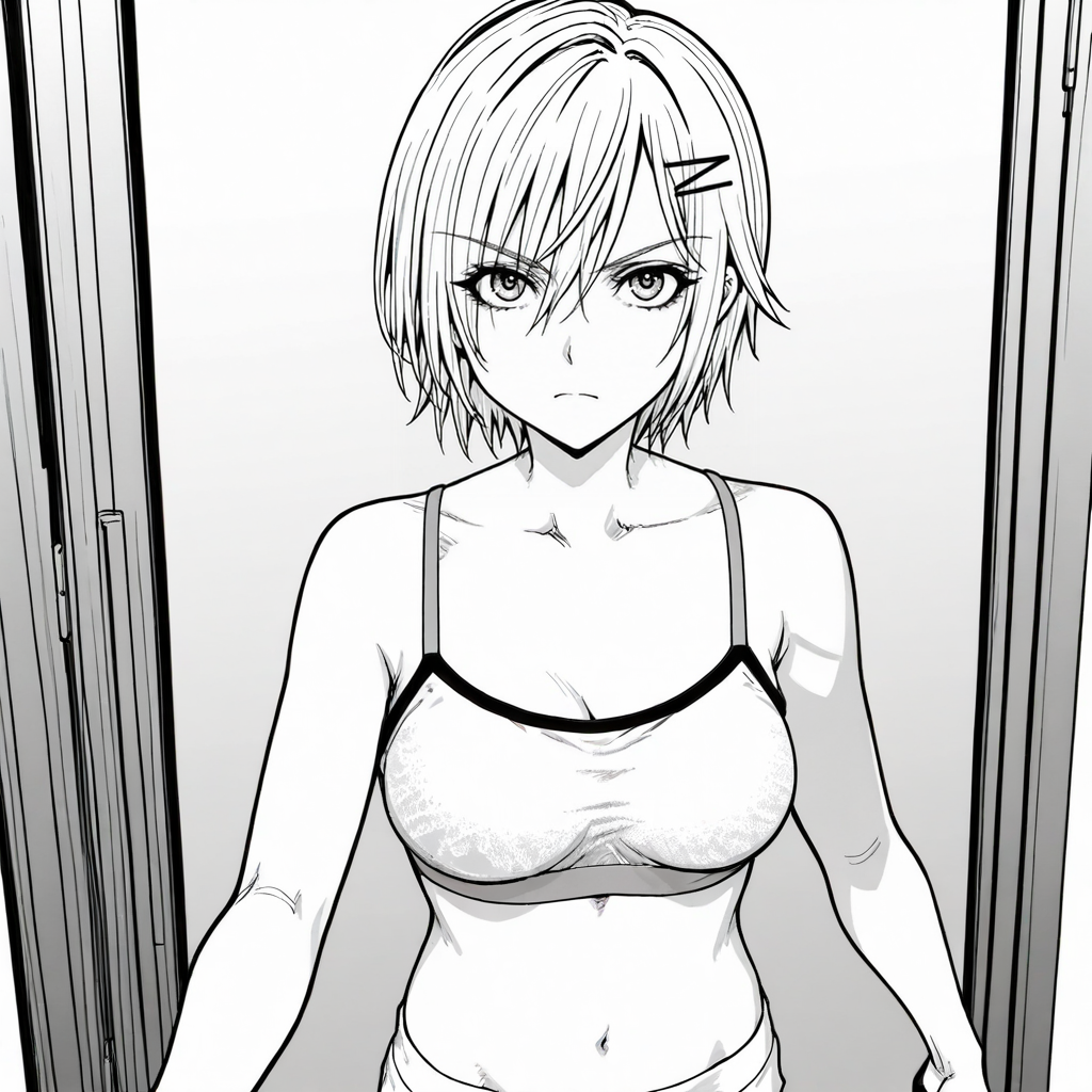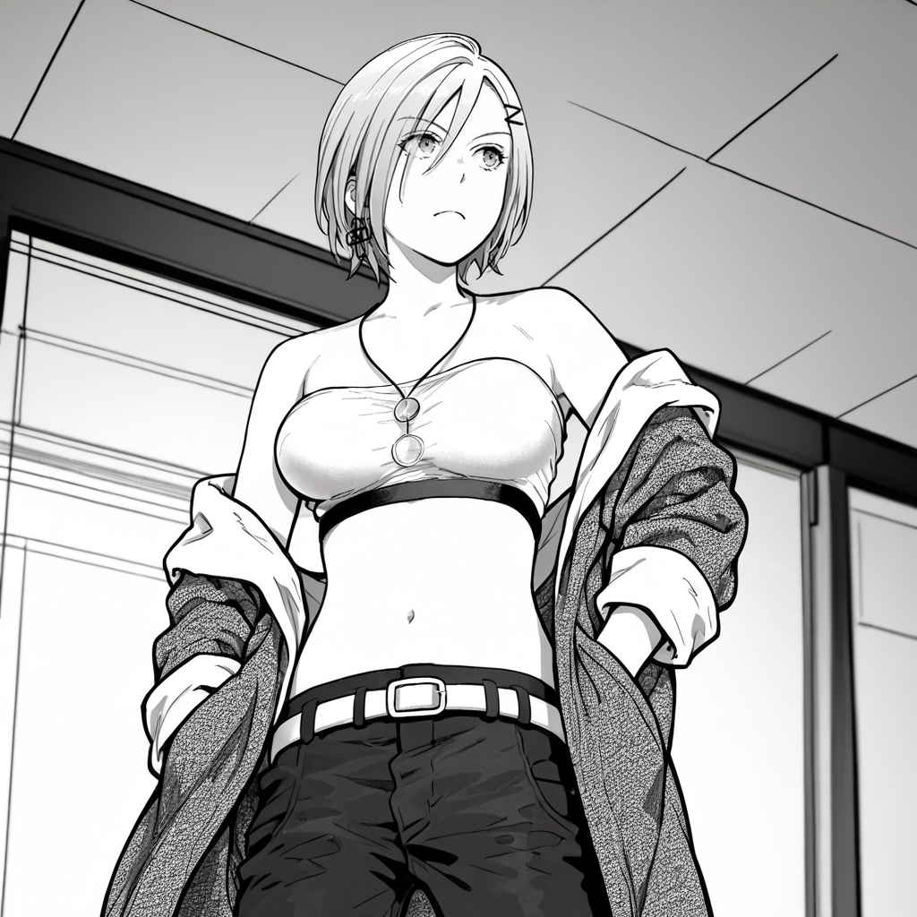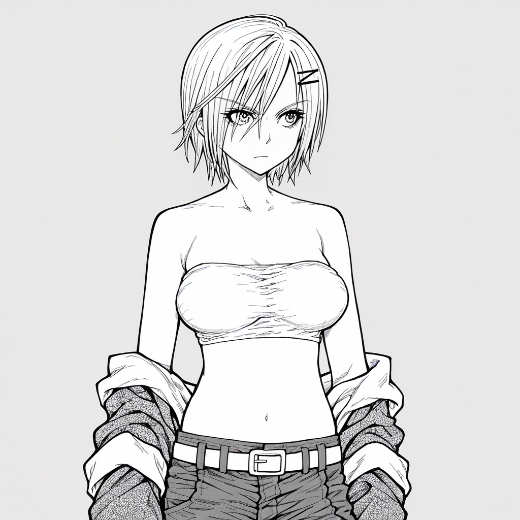 트리거: Imomushi, 1girl, short hair, pants, midriff, navel, strapless, bare shoulders, tube top, breasts, belt, jeans, hairclip, cowboy shot