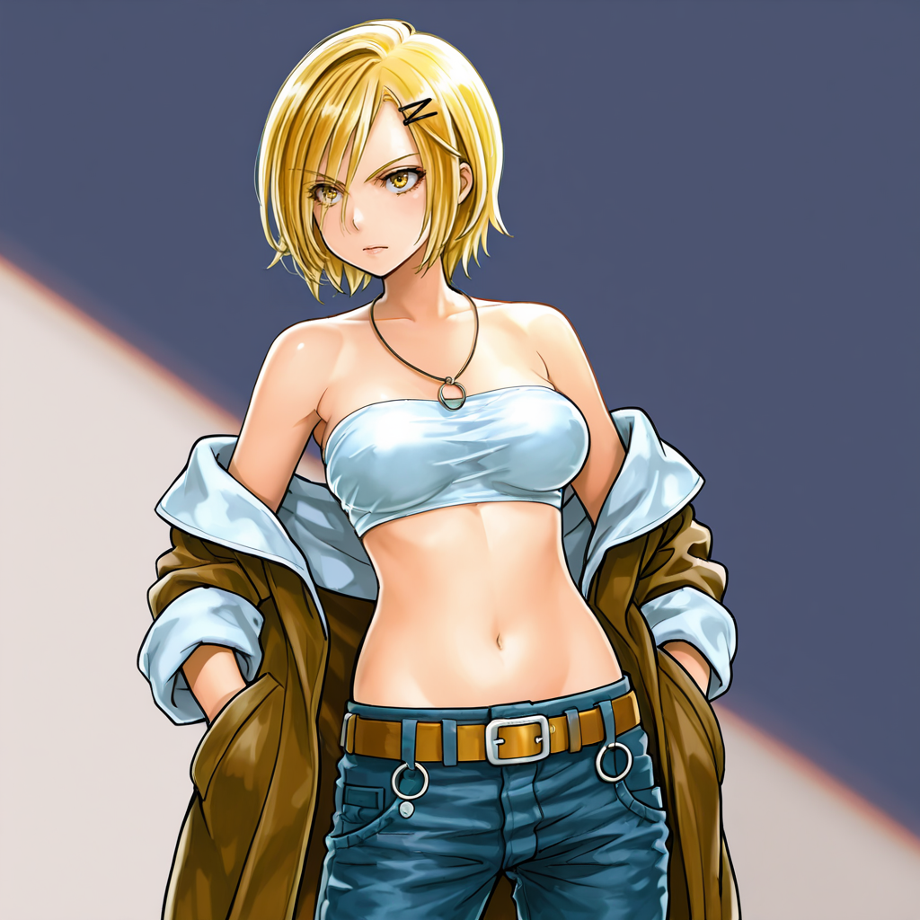 색상 트리거: ImomushiColor, 1girl, blonde hair, hair ornament, jewelry, hairclip, short hair, navel, yellow eyes, necklace, midriff, tube top, bare shoulders, breasts, strapless, jacket, belt, off shoulder, denim, bandeau, cowboy shot