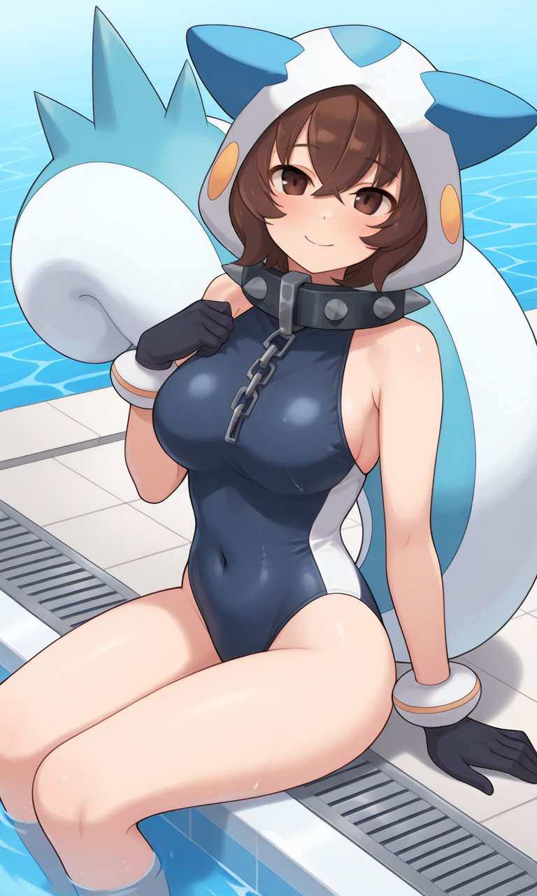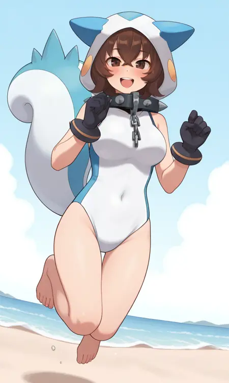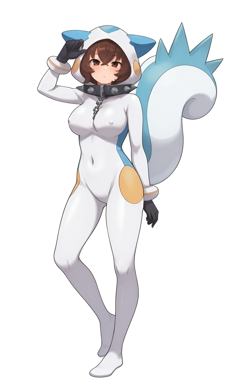A young girl wearing a Pachirisu-inspired outfit, featuring a white and light-blue color palette, fluffy squirrel-like details, and playful electric-themed accents. The design blends cute and energetic aesthetics, with soft textures, rounded shapes, and a lively, cheerful expression. Original character of unknown authorship, based on limited reference images.