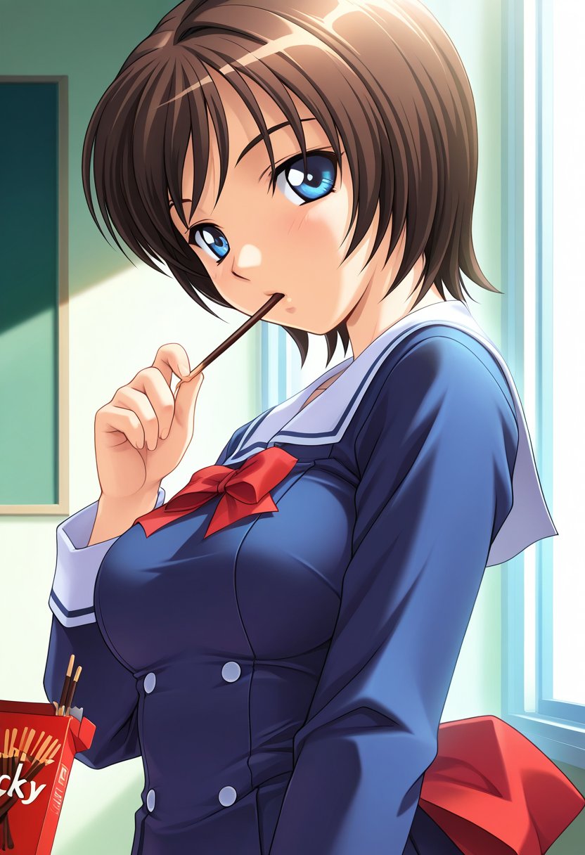 制服, 白いセーラー collar, 赤いリボンネクタイ, 青いセーラー服, プリーツスカート, 短いスカート, 長袖, ボタン, 赤い背中リボン, 白いアンクルソックス, スニーカー,