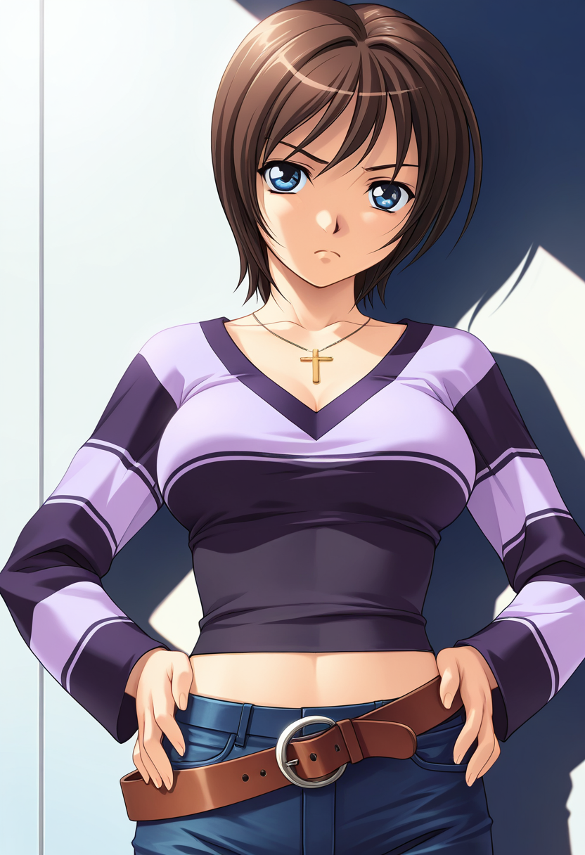 カジュアル, クロスネックレス, Vネック, クロップトップ, ツートンシャツ, 縦縞シャツ, 黒いシャツ, 淡い紫のシャツ, 長袖, 縦縞袖, 黒い袖, 淡い紫の袖, 腹見せ, 茶色のベルト, ルーズなベルト, デニム, ジーンズ, スニーカー,