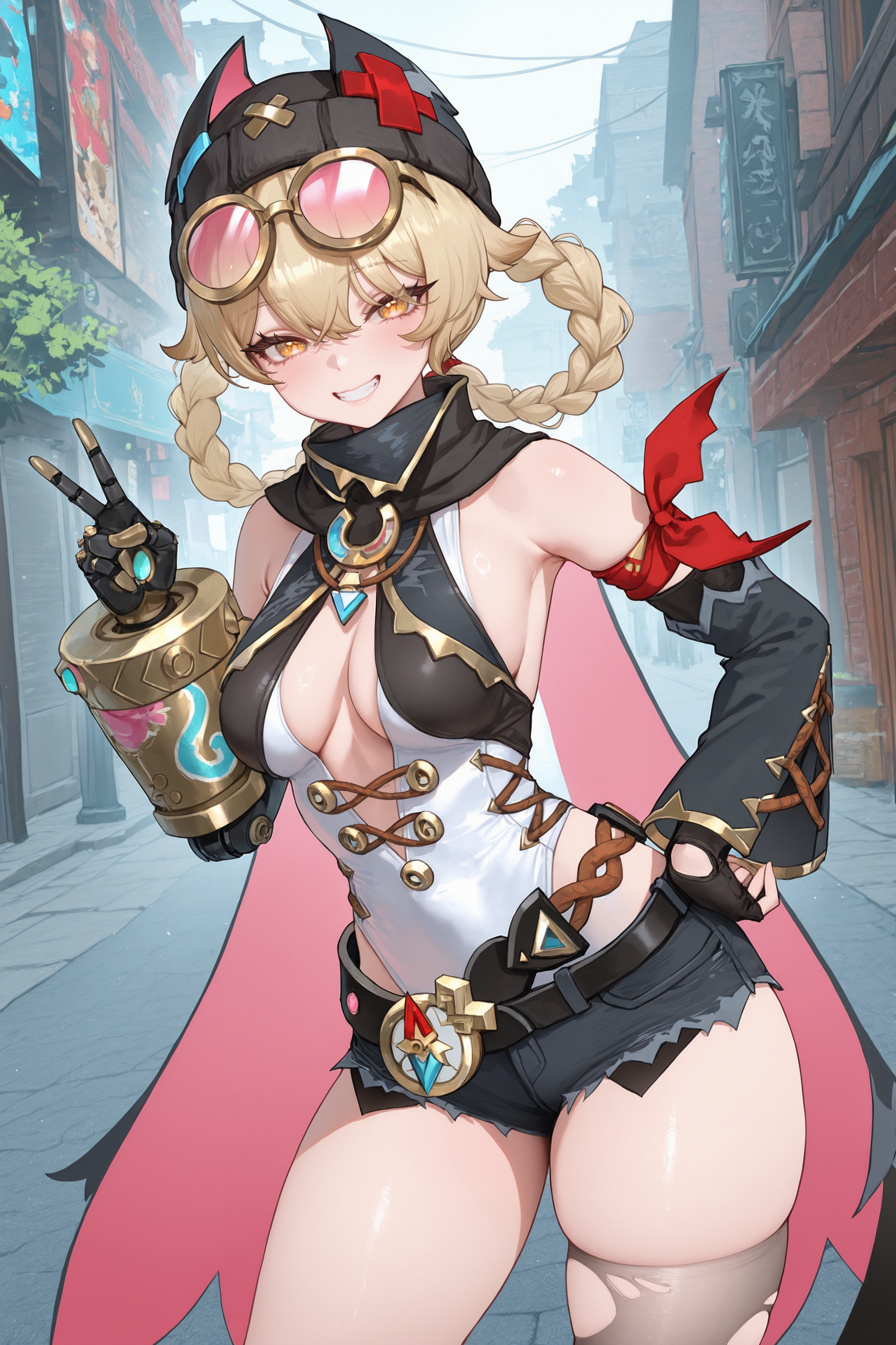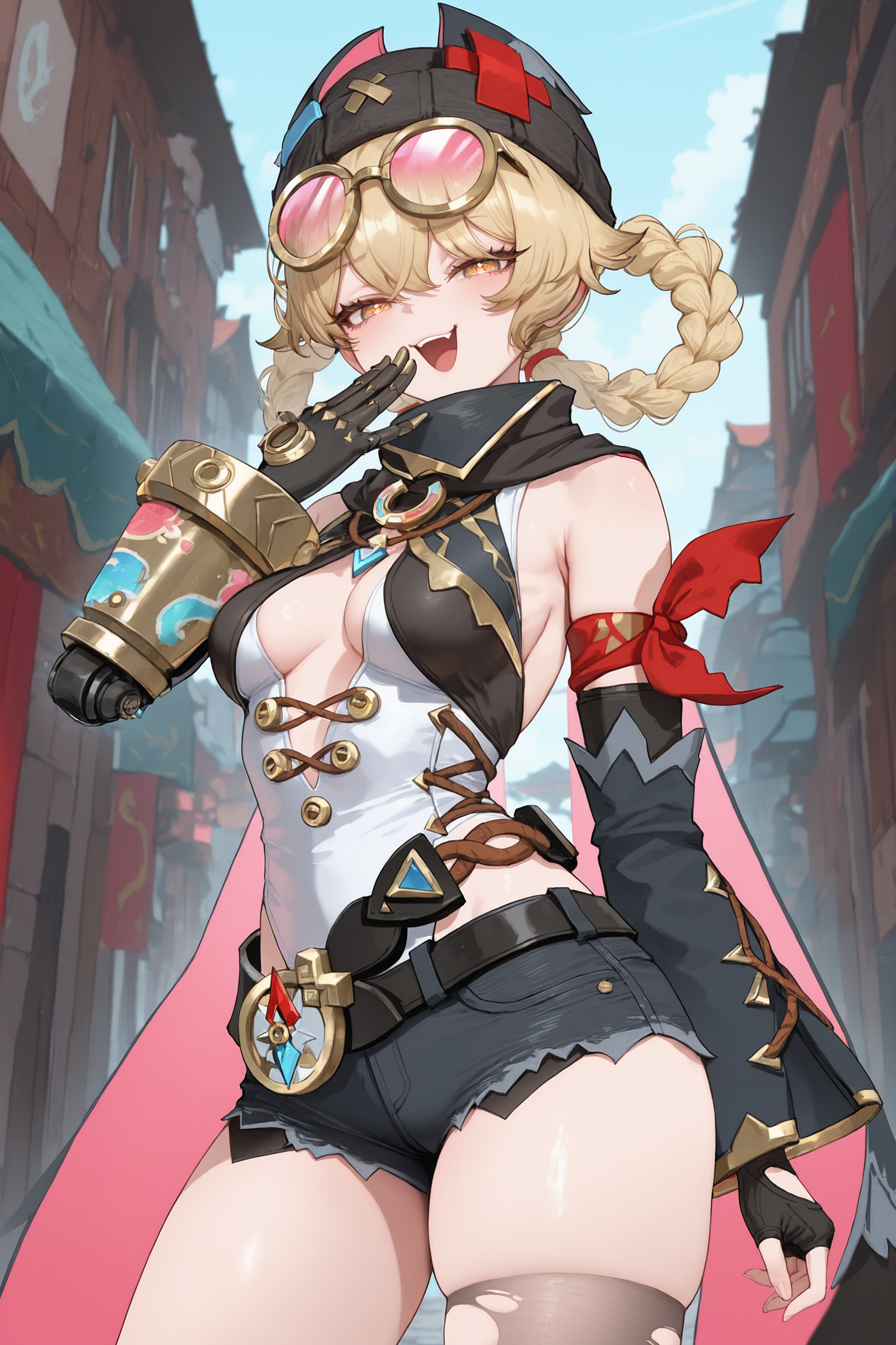 彼女のデフォルト衣装用の追加プロンプト(必要に応じて追加または削除):編み込み髪の輪、黒いニット帽、頭にゴーグル、カラー付きカーペット、取り外し可能な袖、片手の指なし手袋、片側の機械式腕、腕リボン、白いレオタード、ユーティリティベルト、黒いマイクロショーツ、片側の裂けたタイツ、赤い片側の靴下、片側のレッグウォーマー、黒いプラットフォームブーツ