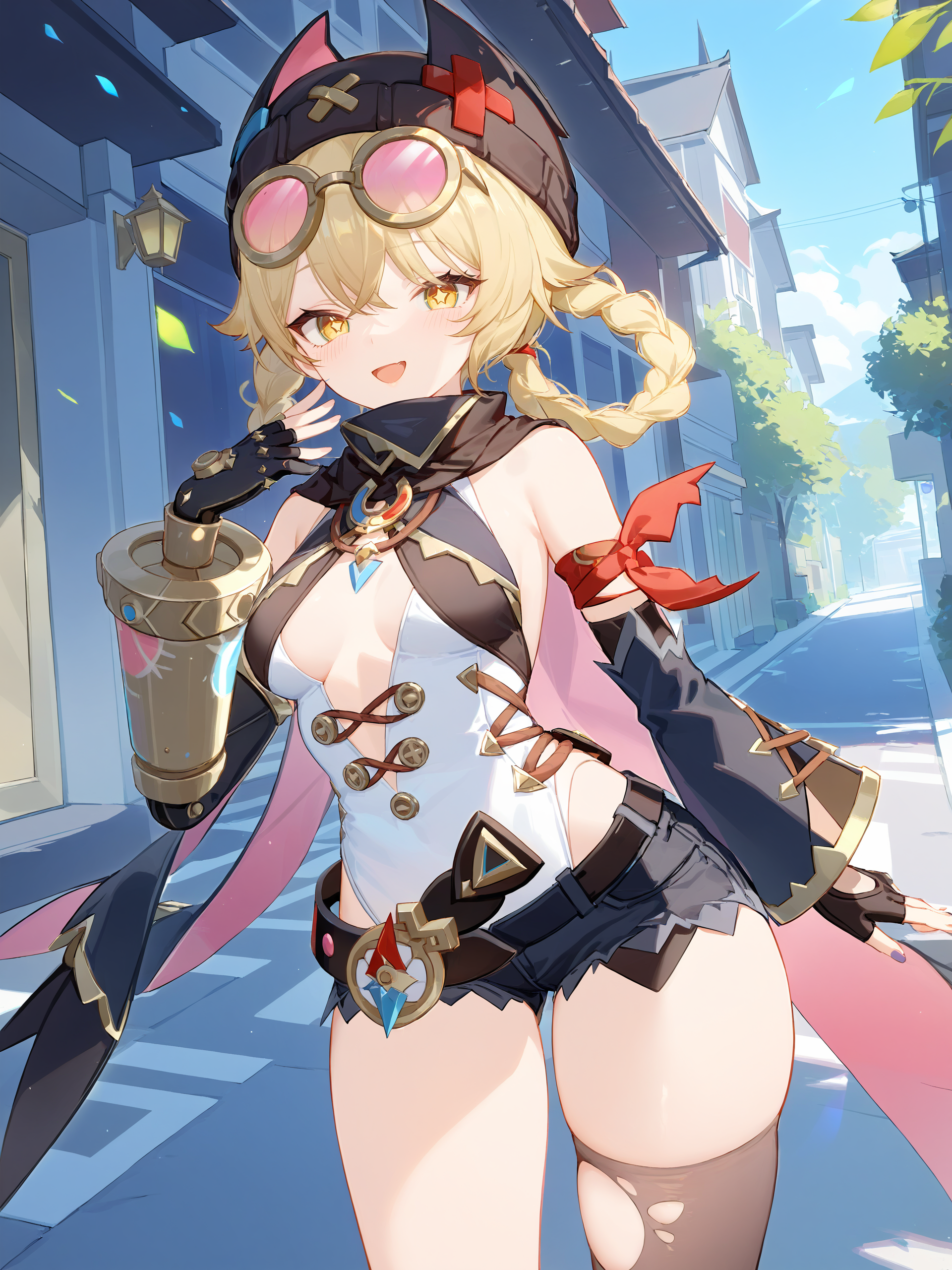 기본 복장용 추가 프롬프트: 땋은 머리 고리, 검은 빈니, 머리 위 안경, 칼라가 있는 망토, 분리된 소매, 한 손만 장갑 없는 장갑, 한쪽 기계 팔, 팔 리본, 흰 레오타드, 유틸리티 벨트, 검은 마이크로 쇼츠, 찢어진 한쪽 허벅지 스타킹, 빨간 한쪽 양말, 한쪽 다리 워머, 검은 플랫폼 부츠