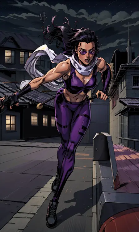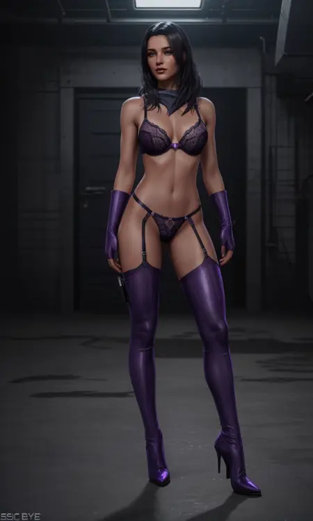 为了正确呈现服装,你可添加:紫色上衣、白色围巾、太阳镜、弓箭手手套、露腹、战术装备和多功能腰带。