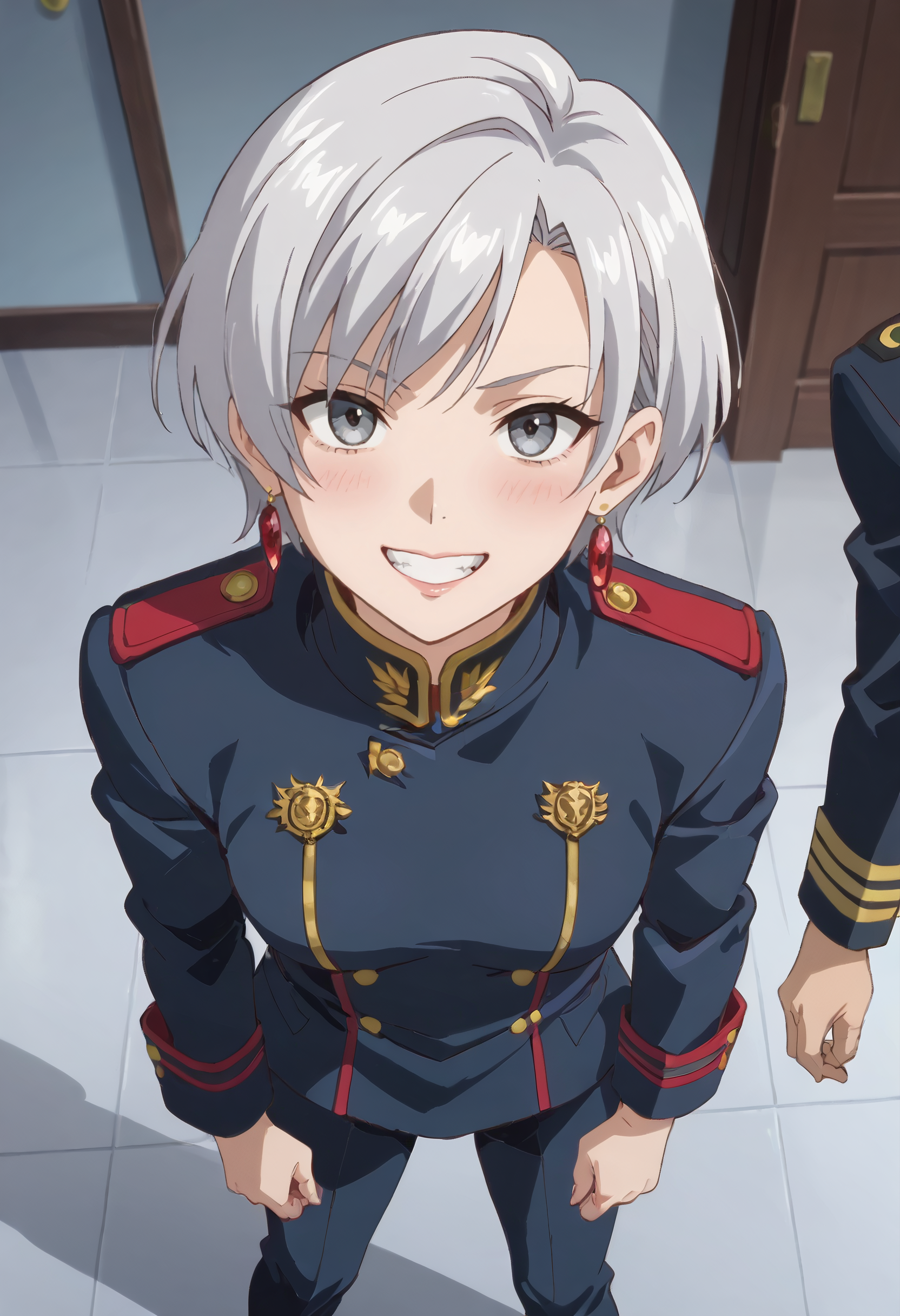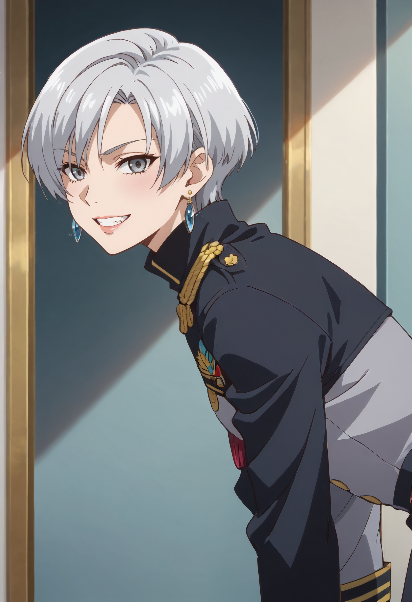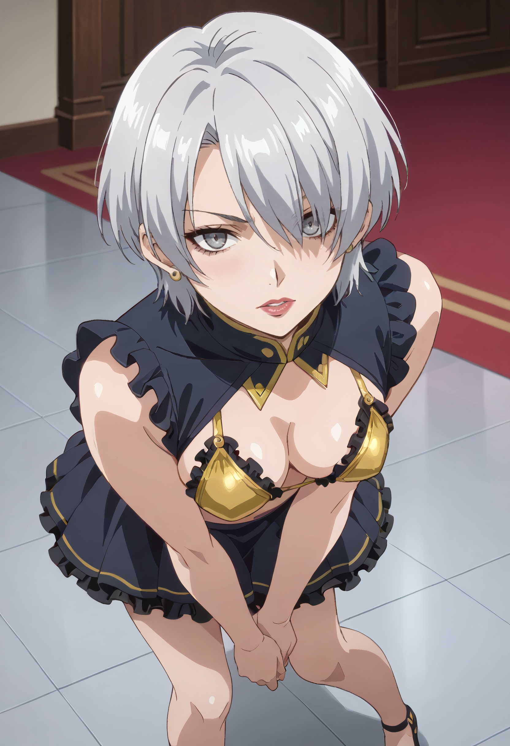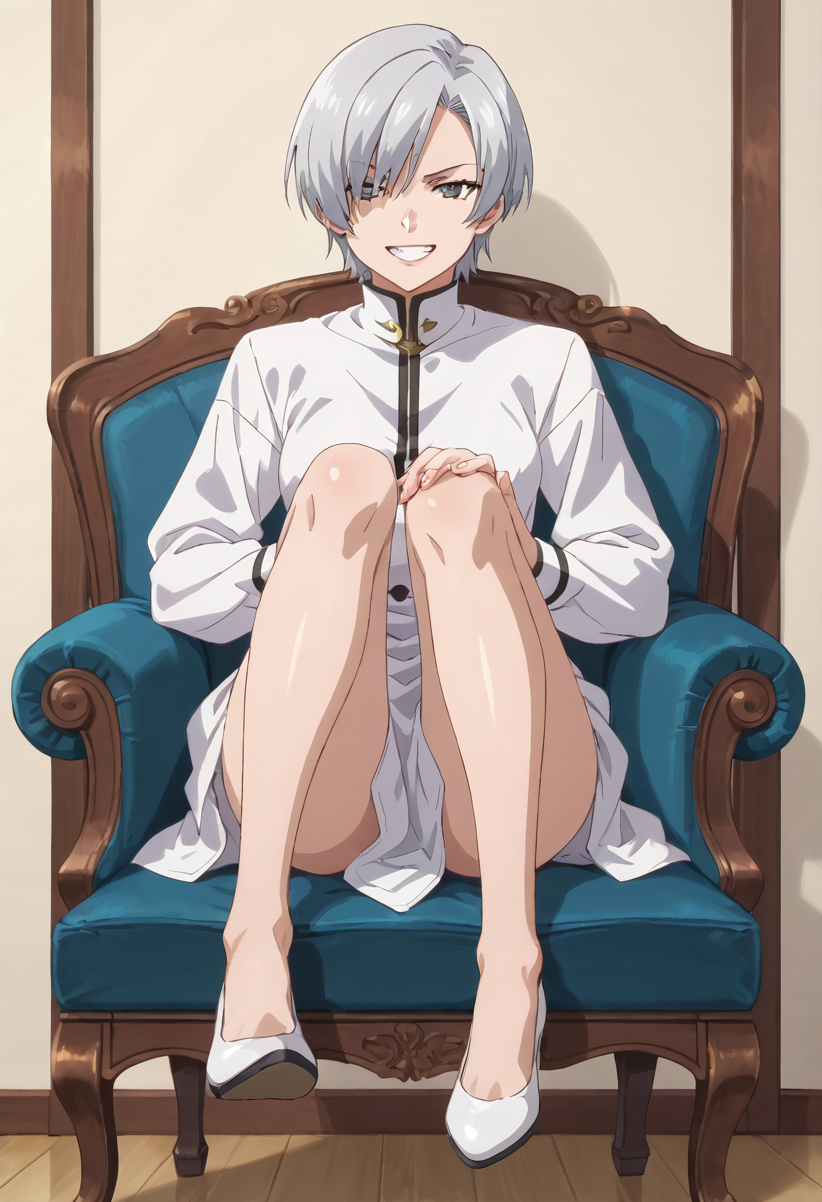 KSGEzalia、ショートヘア、シルバーの髪、片方の目に髪がかかる、グレーの目、前髪、