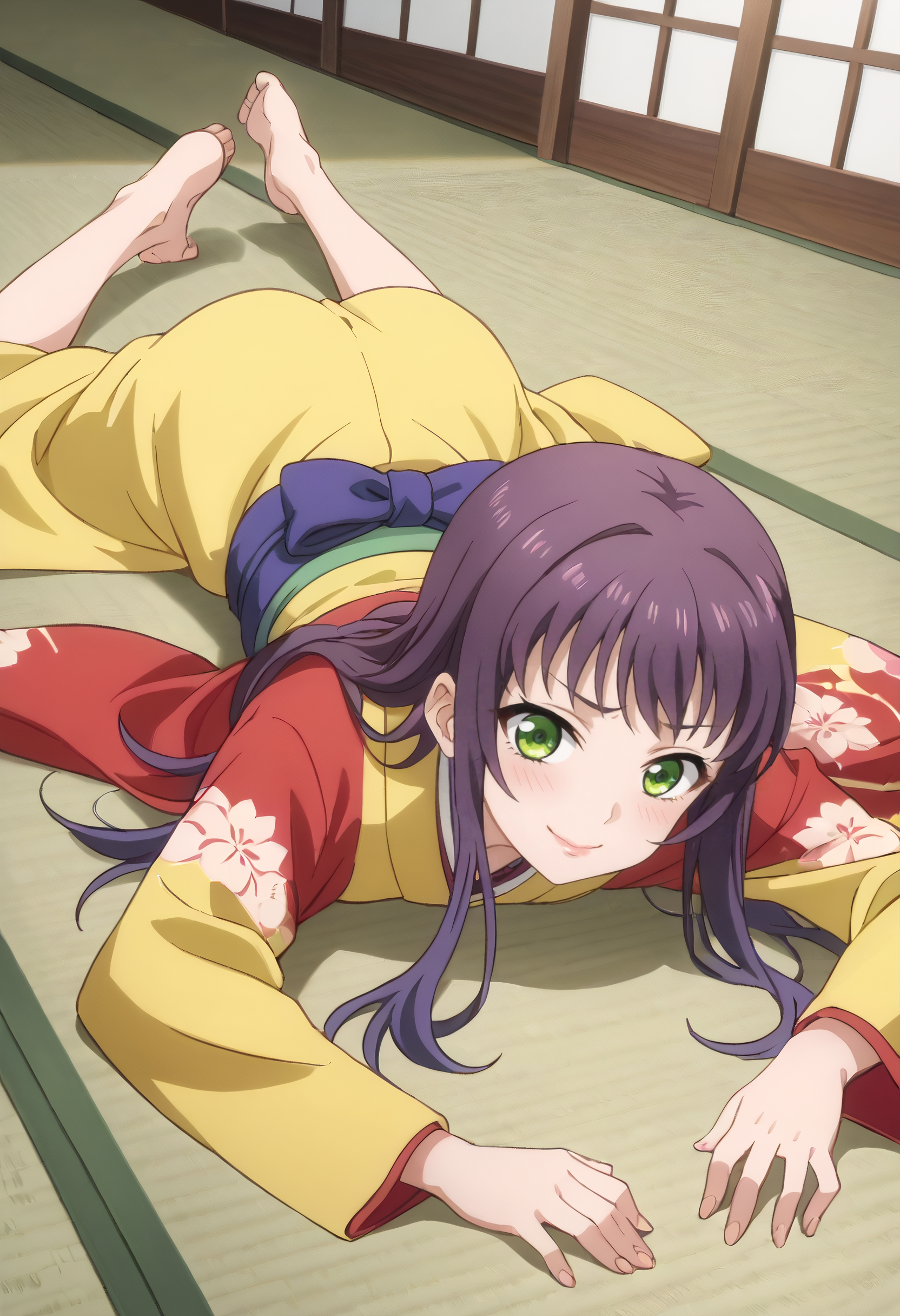 KyokaRobe、和服、着物、ロングスリーブ、畳、黄色い着物、障子、ローブ、赤いローブ、帯、緑の帯、