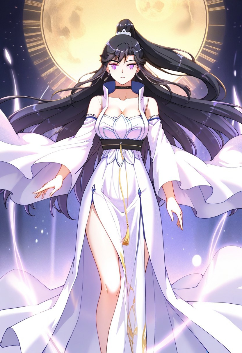 qi zixiao,1girl,black hair,breasts,cleavage,long hair,ponytail,