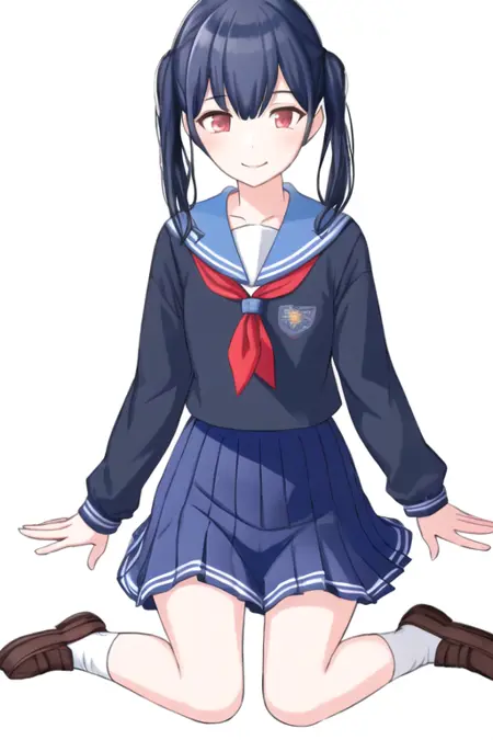 1girl, solo, black hair, looking at viewer, white background, purple eyes, twintails, simple background, bangs, hair ornament, skirt, ribbon, hair ribbon, long sleeves, dress, smile, gloves, shirt, short sleeves, pleated skirt