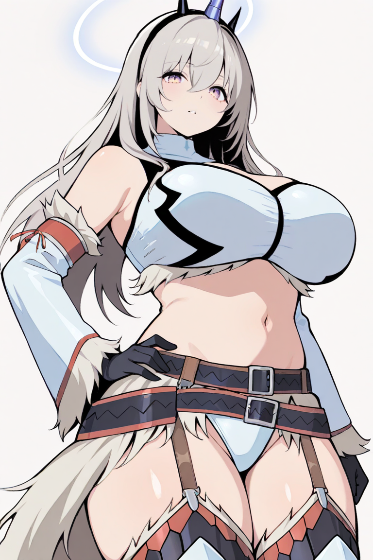 プロンプトヘルパー:Serenielczn、灰色の髪、紫色の目、ハロー、シンクハイズ、目の間の髪、長い髪、レオタード、肩出し、太もも間の隙間、白いレオタード、取り外し可能な袖、ハイレグ、髪飾り、透明な飾り