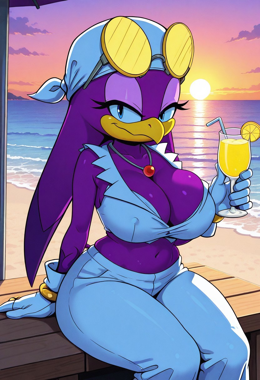 Wave the Swallow, magenta fur, yellow beak, blue eyes, white cap, yellow goggles, white crop top, red gem necklace, midriff, baggy white pants, gold ring wristbands, white gloves, red heeled shoes