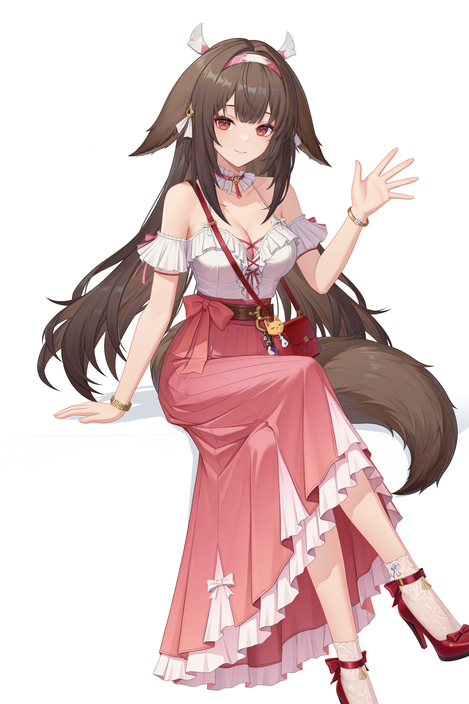 white shirt,red footwear,bow skirt,white socks,fox tail,ankle ribbon,high heels,ribbon,long skirt,spaghetti strap,off-shoulder shirt,pink skirt,bag,
