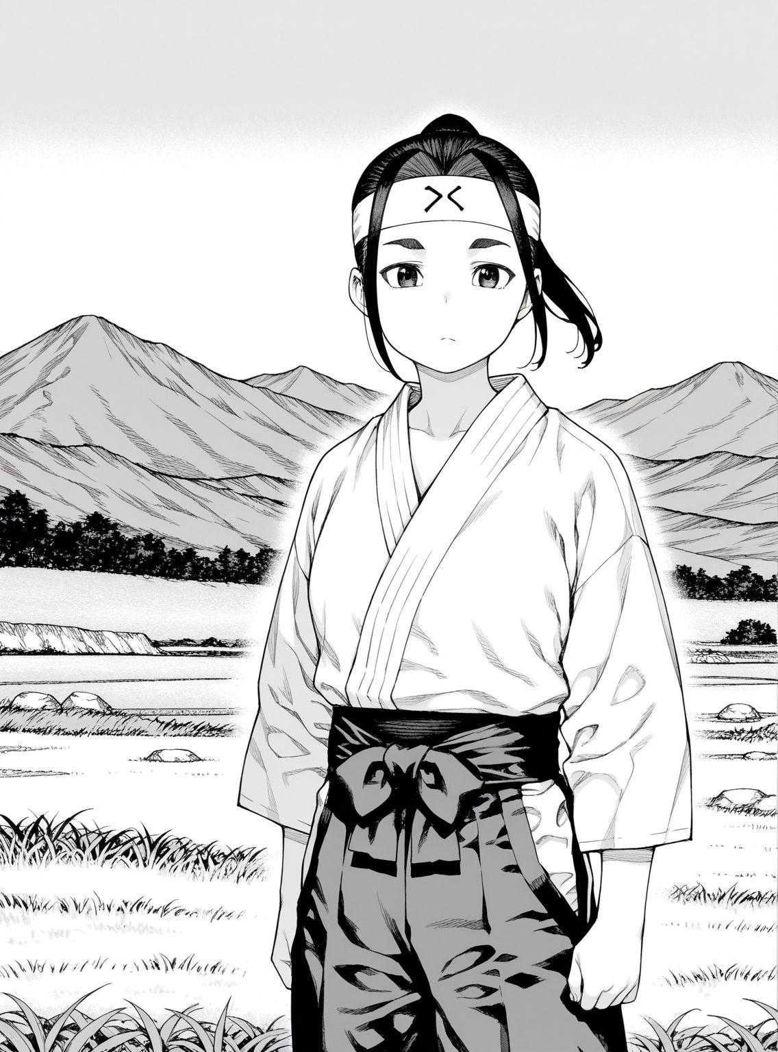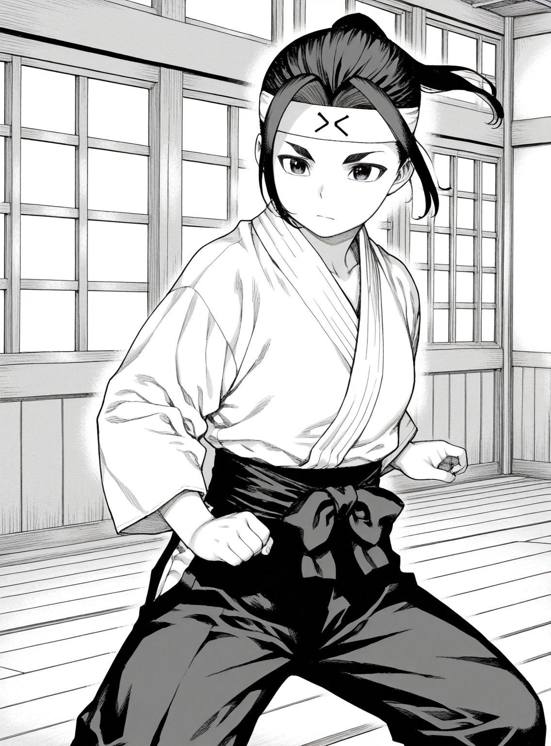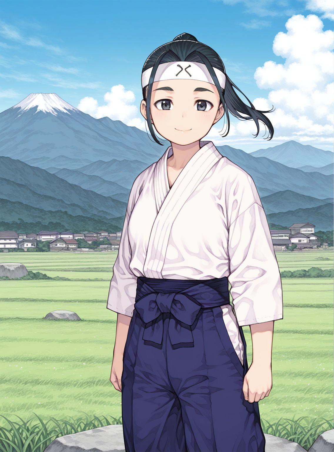 TakanoTagusariTSU, black hair, black eyes, ponytail, japanese clothes, dougi, long sleeves, hakama pants, white headband
