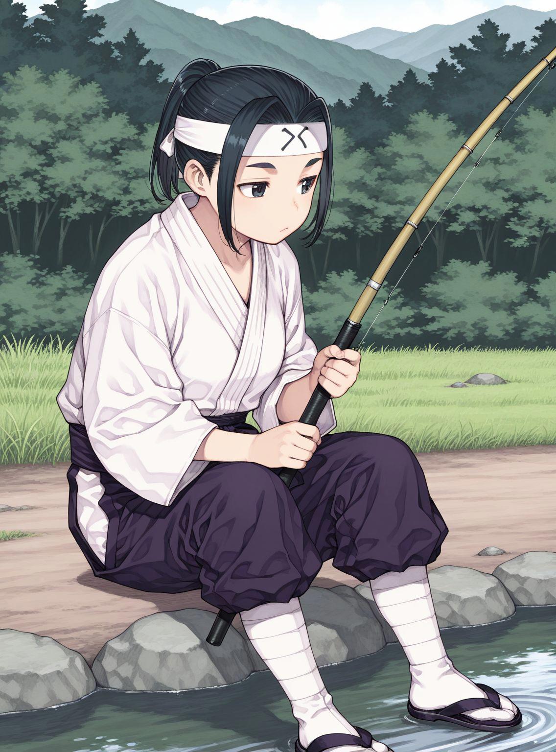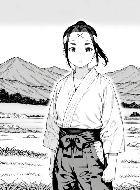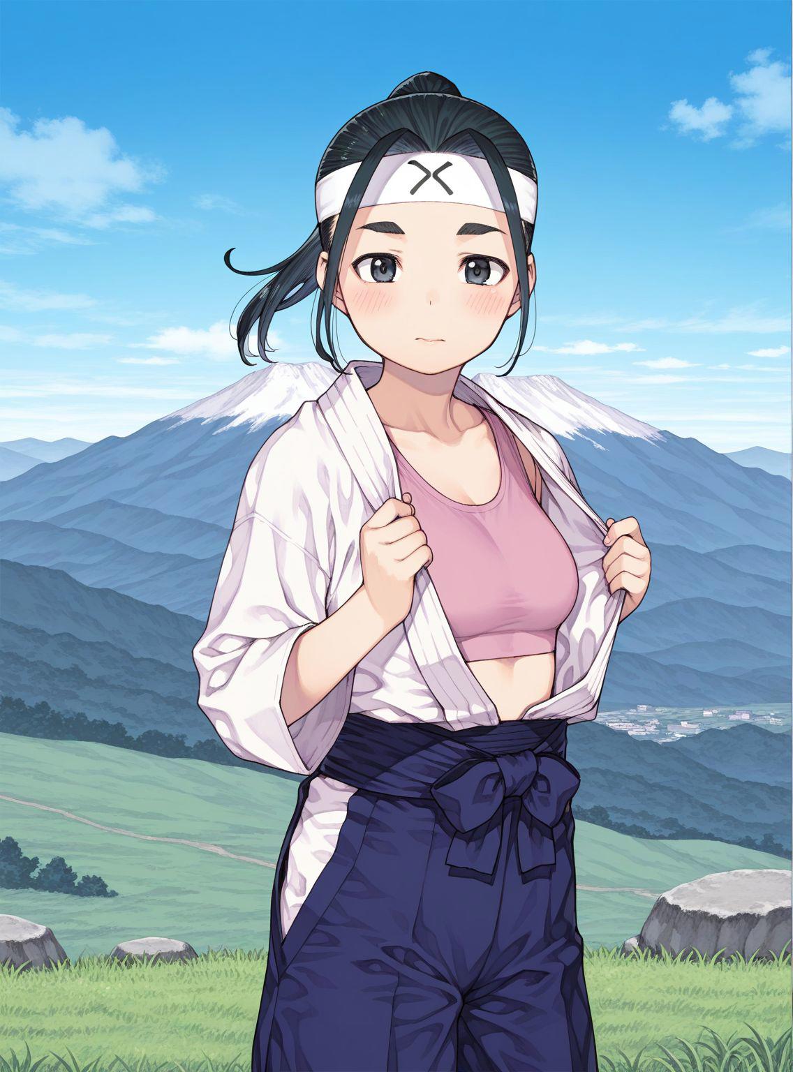 TakanoTagusariTSU, black hair, black eyes, ponytail, japanese clothes, dougi, long sleeves, hakama pants, white headband