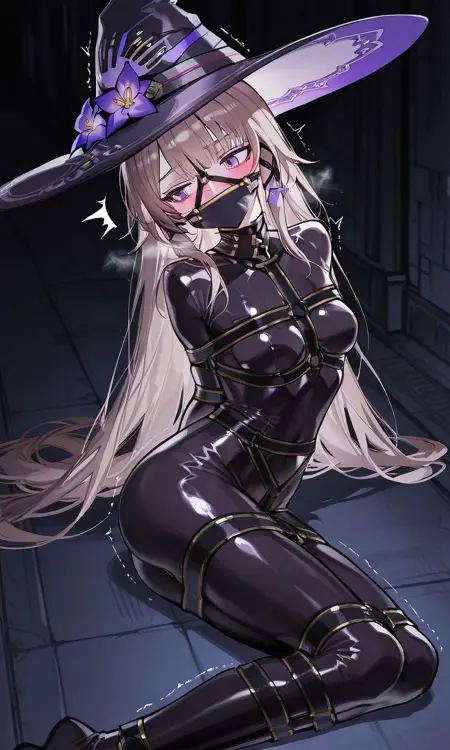 INFP_concept, sleepsack, posture collar, covered neck, arms behind back, bound, bdsm, bondage, skin tight, black bodysuit, bound arms, harness, latex, bound legs, latex bodysuit, restrained, collar,