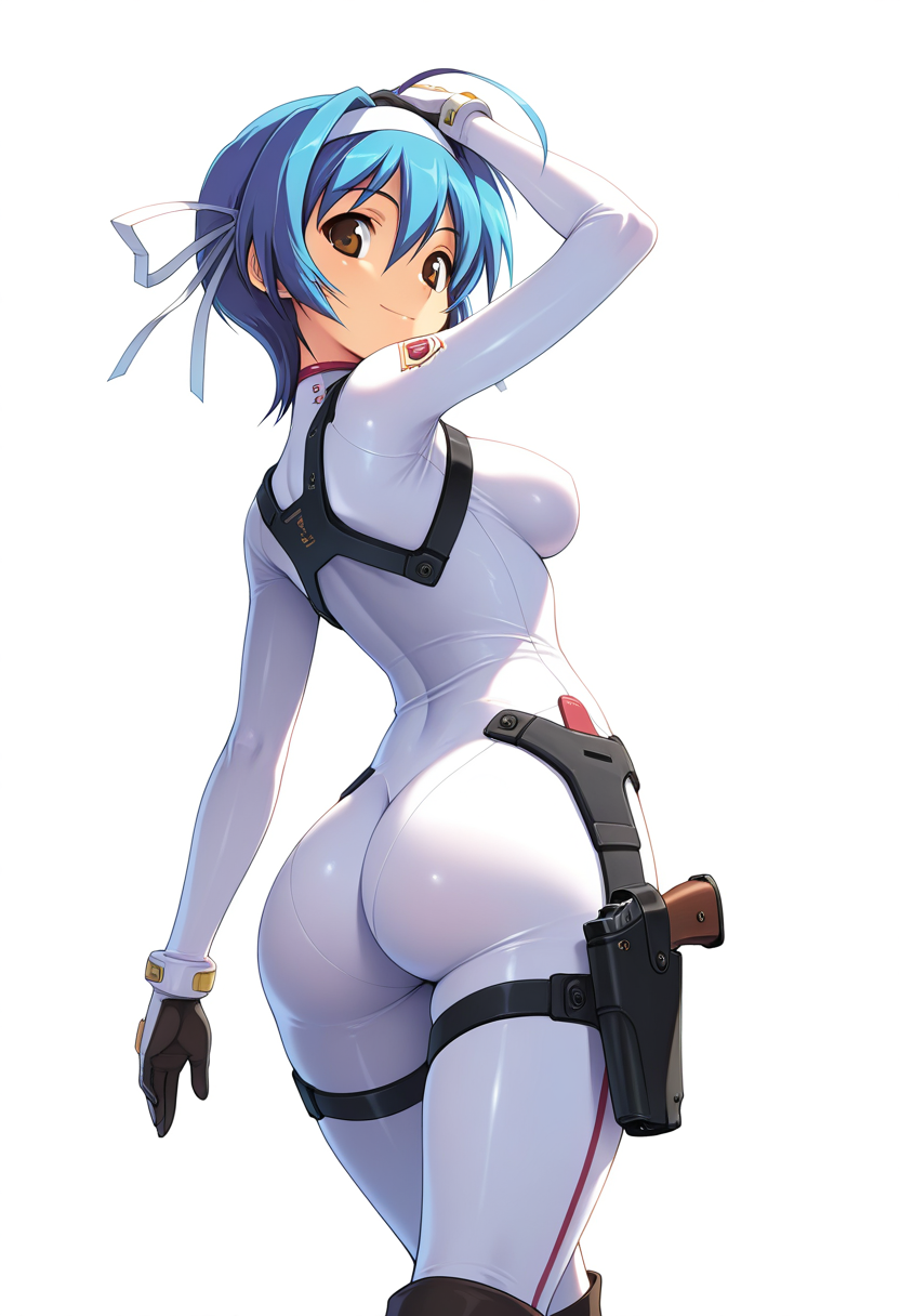 • yuunaww, 茶色の目, 青髪, 短髪, 目の間の髪, 白いヘアバンド, 髪リボン, 白いリボン, アホ毛, 小さな胸