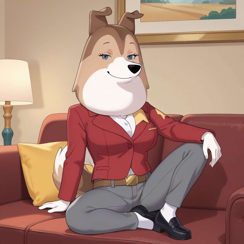 dog, dog girl, rough collie, brown and white fur, blue eyes, black nose, dog ears, dog tail,