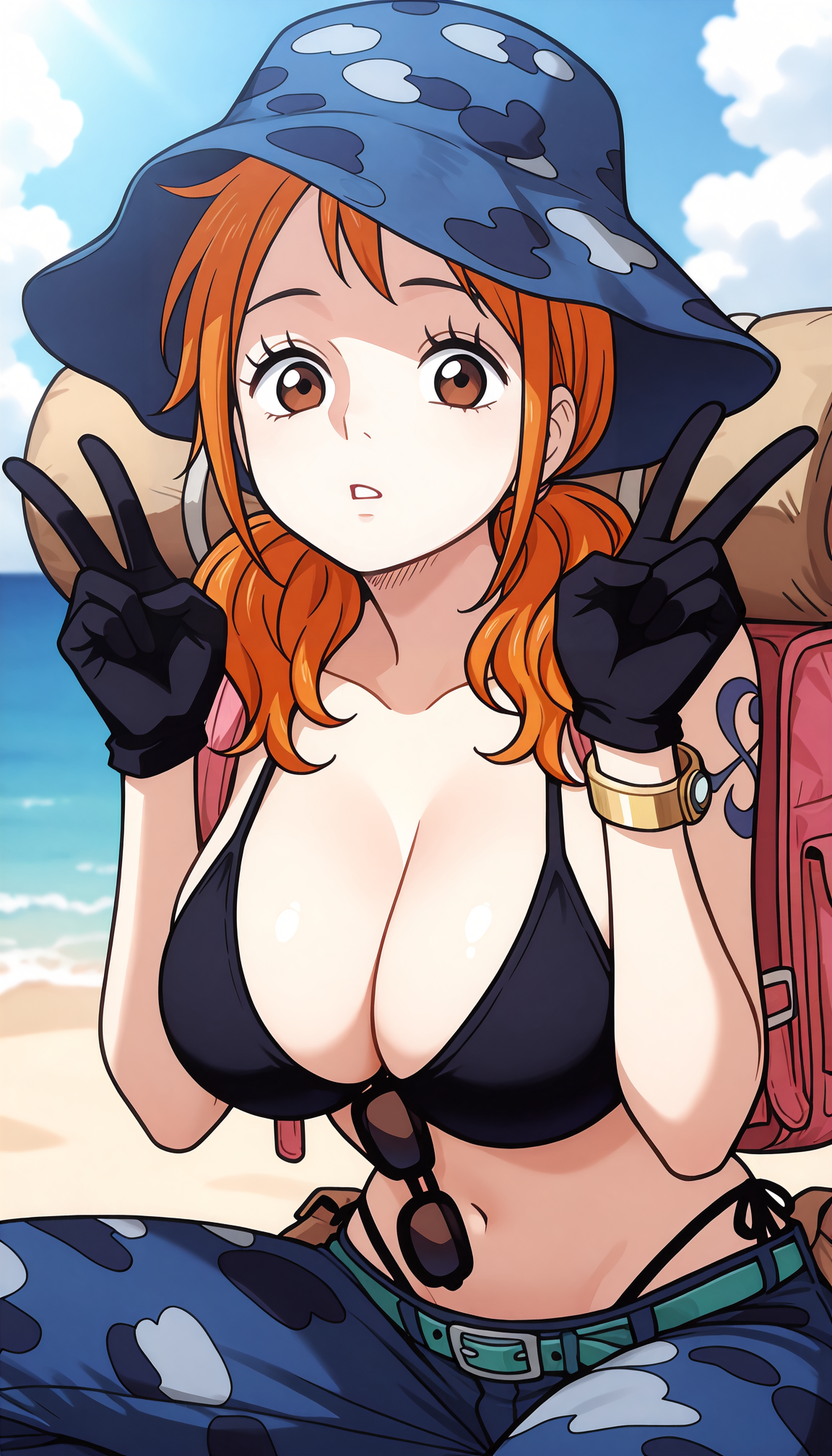 | 训练词汇 | n4m1hg1, brown eyes, orange hair, medium hair, low twintails, blue headwear, bikini top only, black bikini, sunglasses, eyewear hang, string bikini, highleg bikini, shoulder tattoo, blue tattoo, black gloves, bangle, gold bracelet, log pose, pink backpack, bedroll, camouflage pants, blue pants, denim, jeans, aqua belt, belt pouch,已复制! |