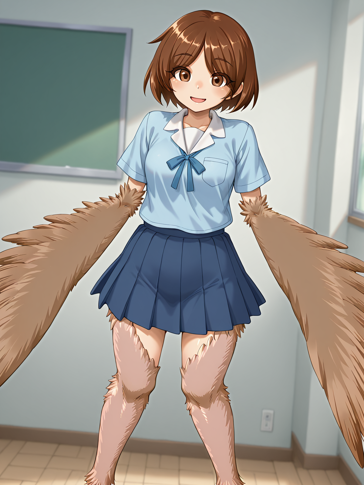 ChirpMGQ, 1girl, harpy girl, monster girl, short brown hair, brown eyes, light brown lower torso plumage, cream feather tips, dark brown wing feathers, warm brown feathered hips, wing arms, bird legs, feathered tail, talons