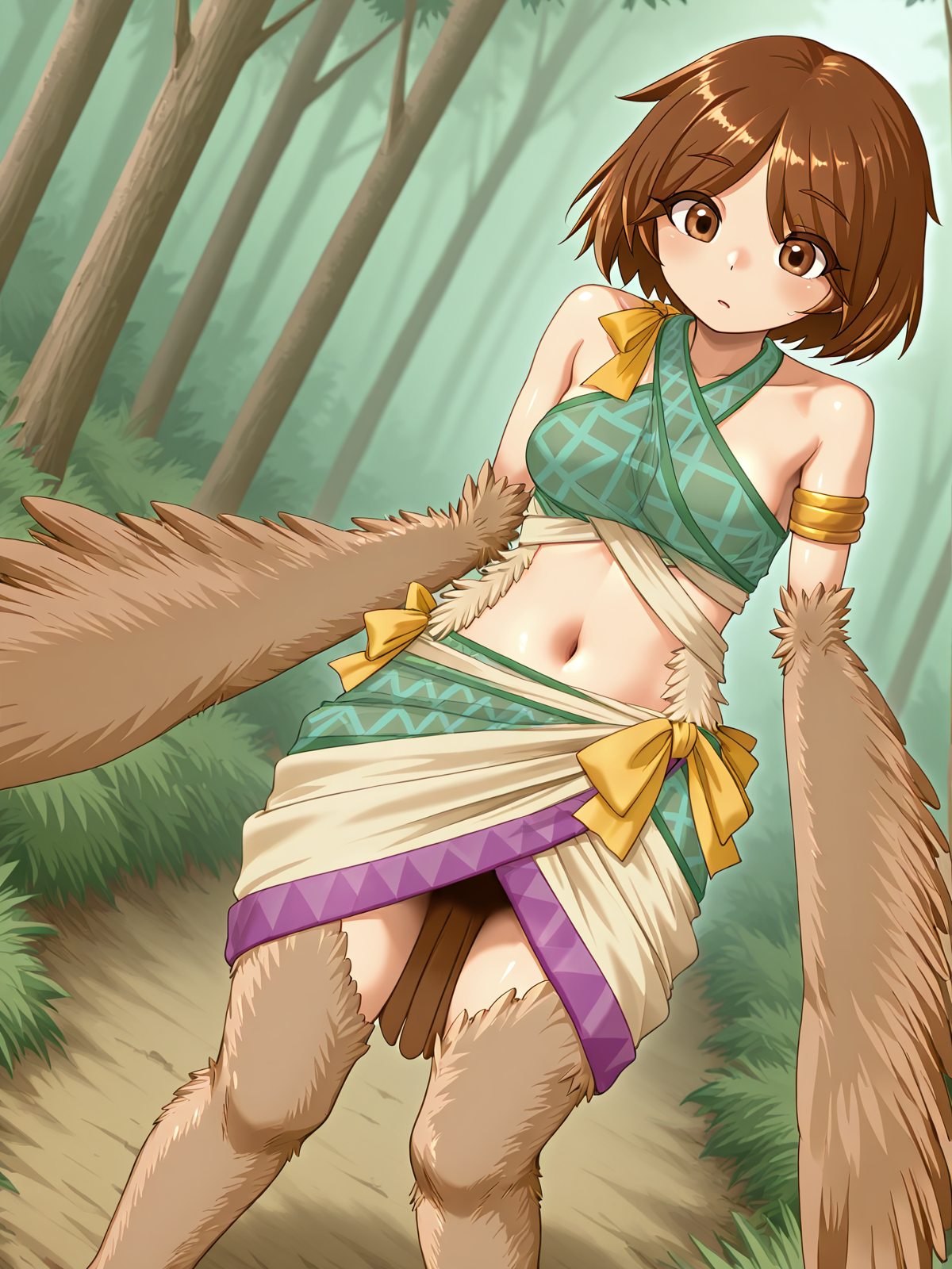 ChirpMGQ, 1girl, harpy girl, monster girl, brown eyes, green patterned crop top, cream wrap top, layered wrap skirt, purple and yellow sash, hip bow