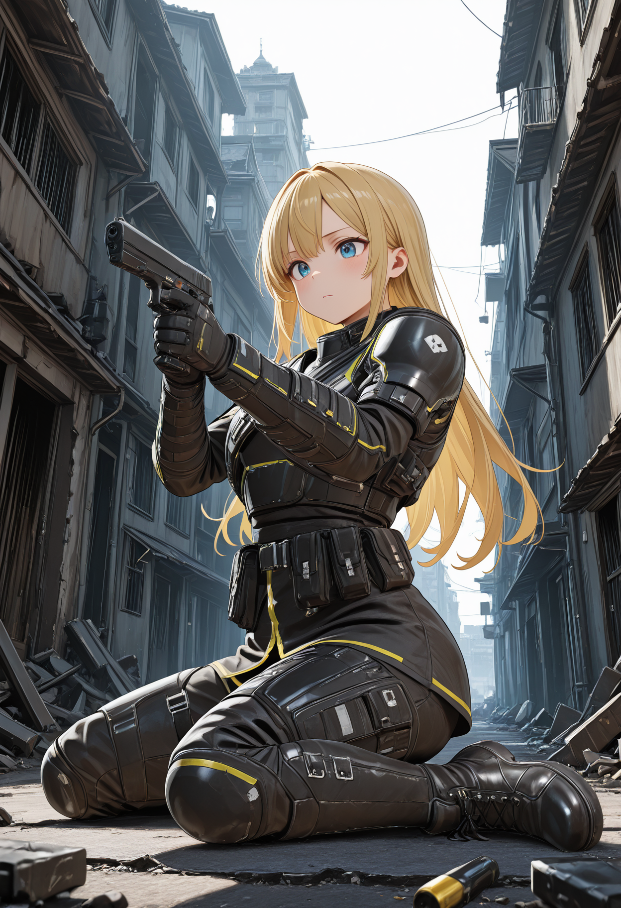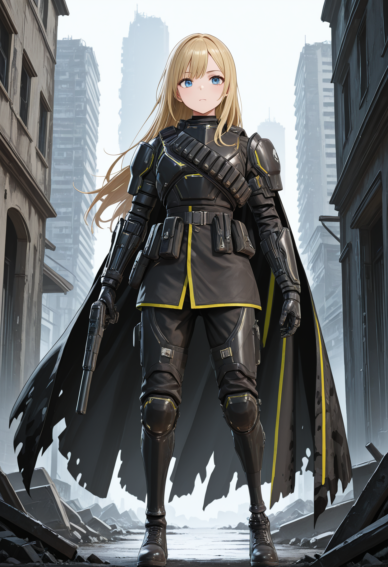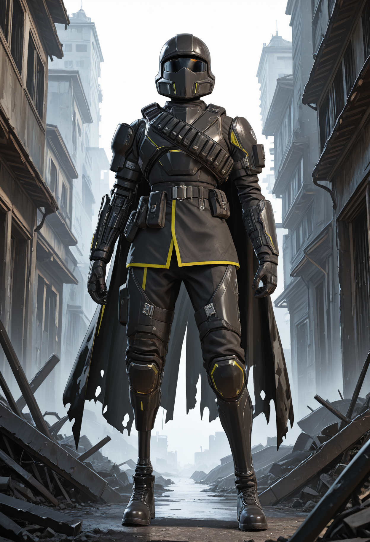 sa25, black combat boots, black tactical tunic, black cuirass, yellow trim, bandolier on cuirass, pauldron, right mechanical arm, vambraces, belt, black tactical gloves, embedded glowing blue wrist computer on the underside of left vambrace, black tactical trousers, greaves, multiple tactical pouches, right prosthetic leg, multiple tactical pouches,