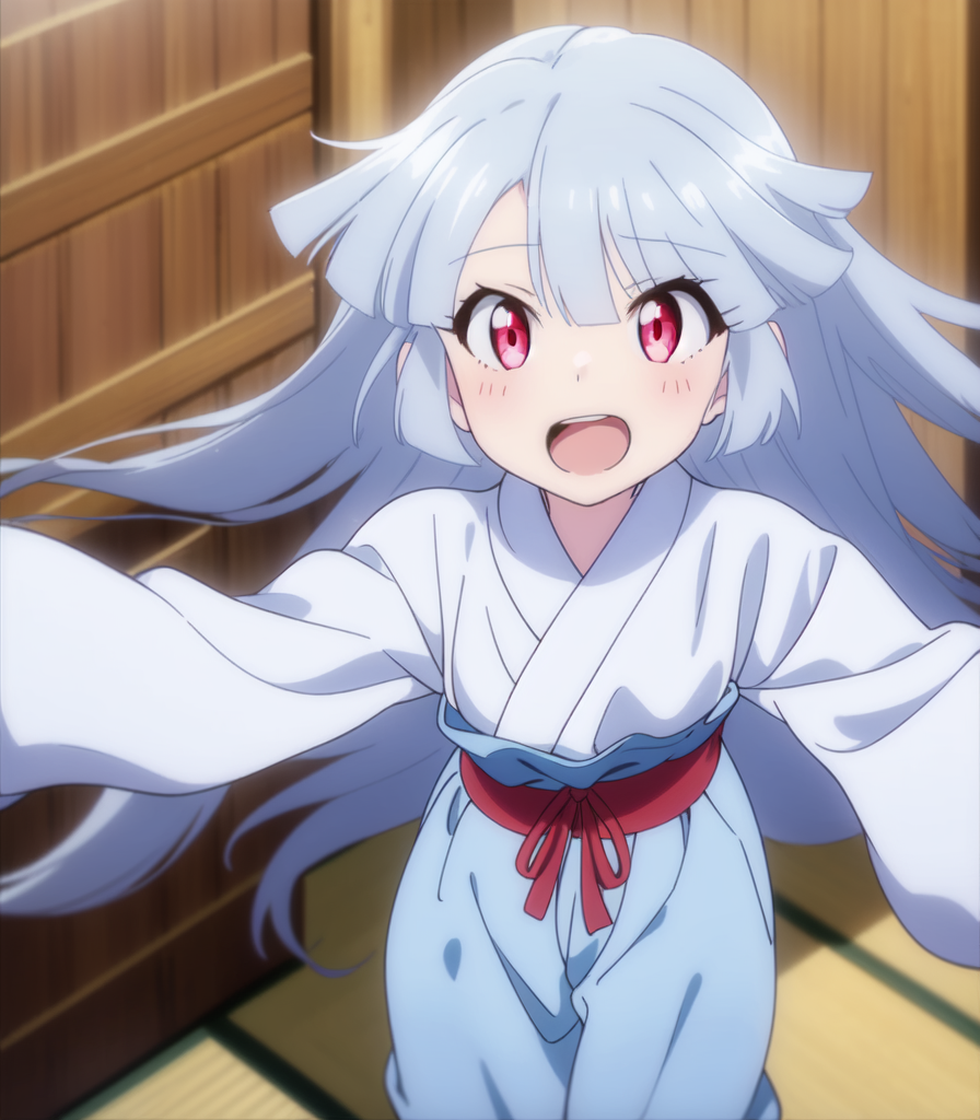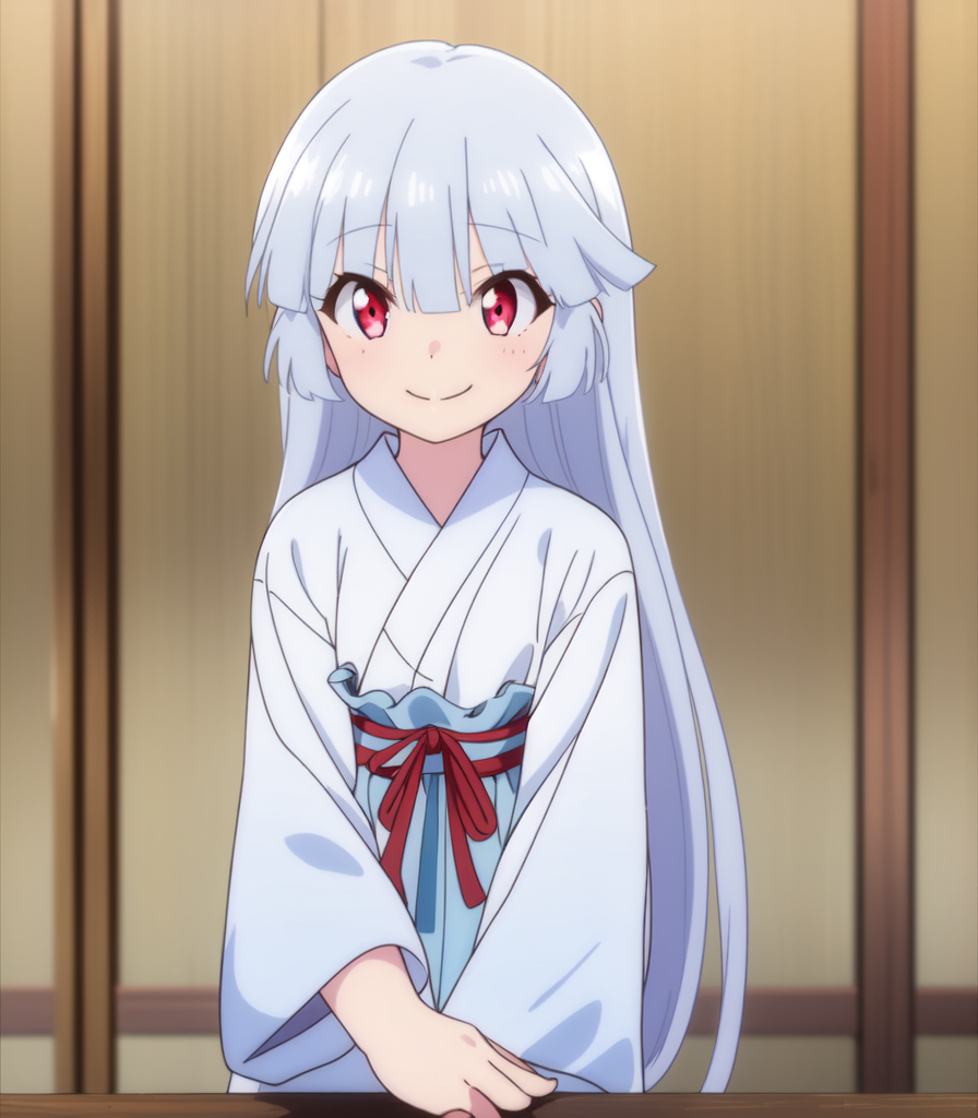 1girl, solo, long hair, looking at viewer, smile, bangs, hime cut, red eyes, long sleeves, hair between eyes, closed mouth, standing, full body, grey hair, boots, japanese clothes, wide sleeves, kimono, sash, brown footwear, obi, white kimono
