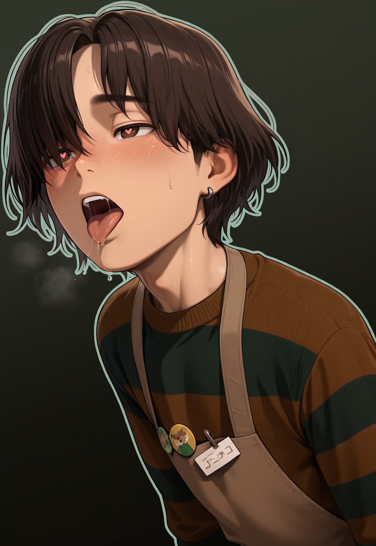 brown sweater, dark green stripes, stripped sweater, light brown apron, pin badge,